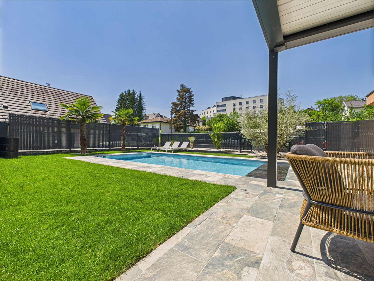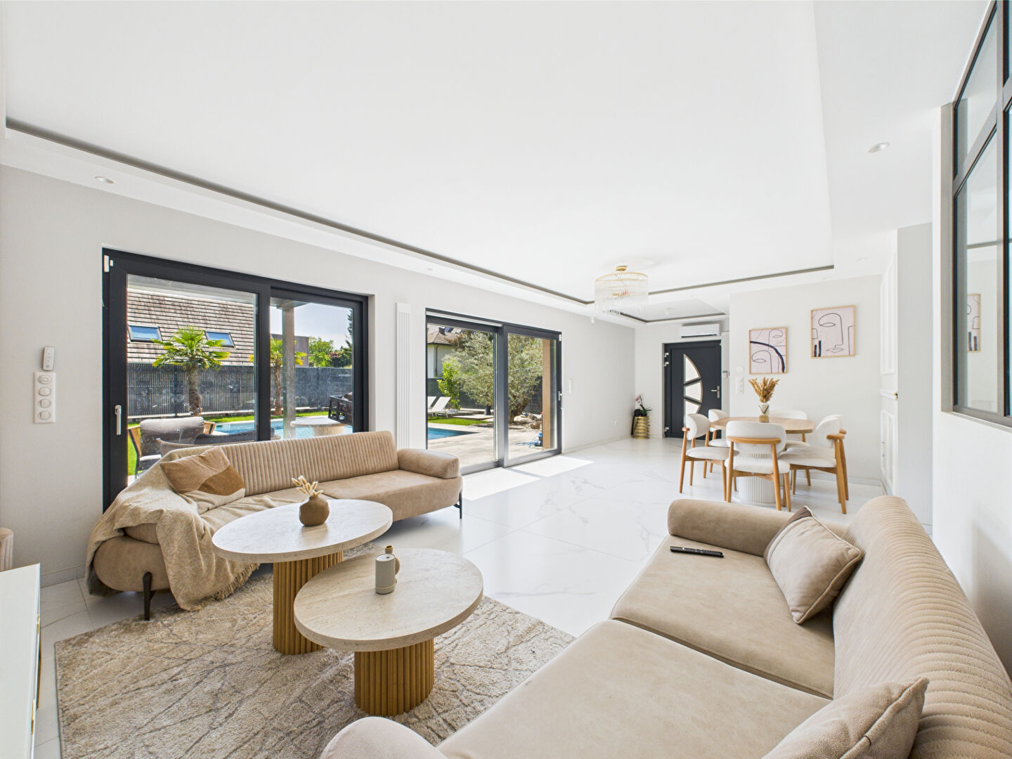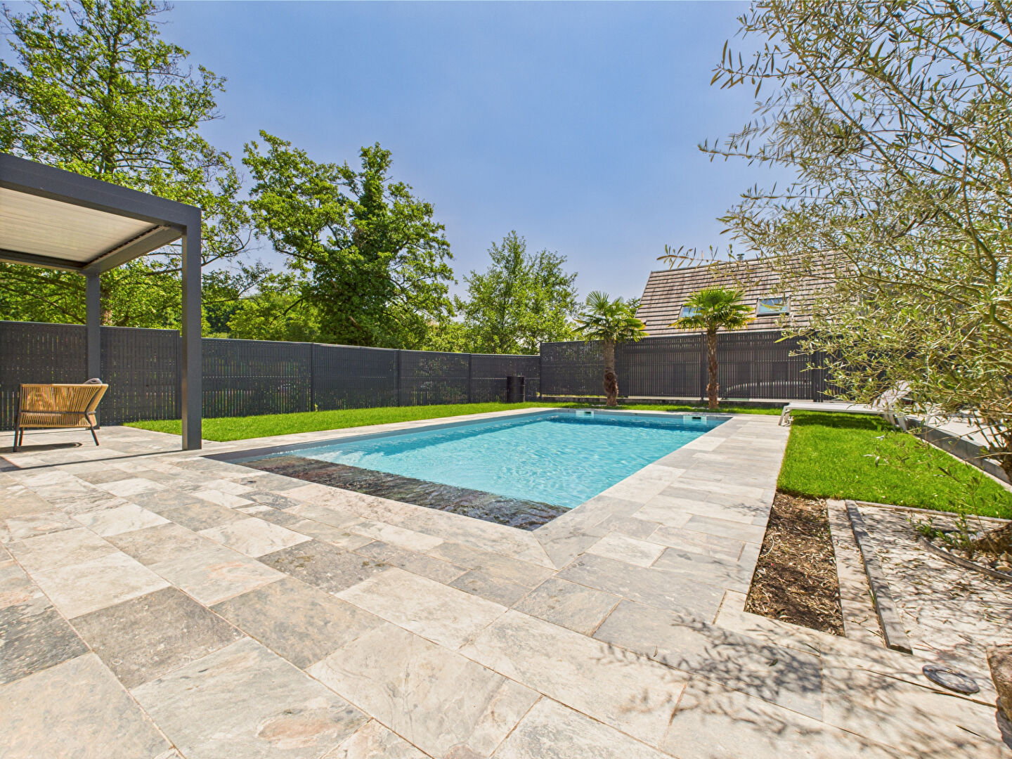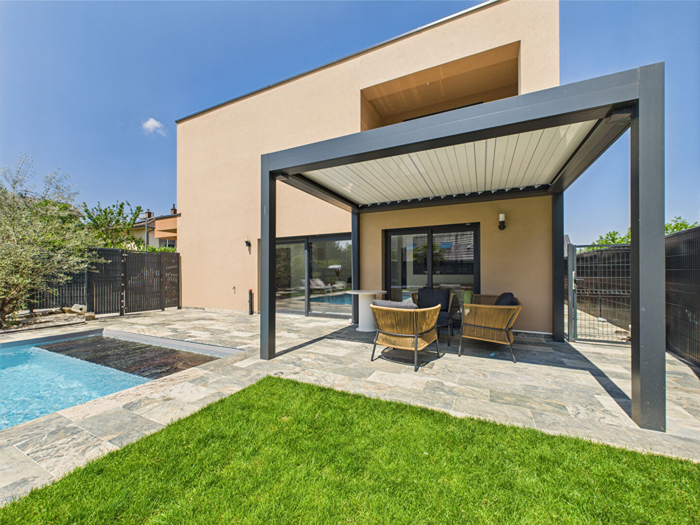 Piscine de 4x8m avec volet de securité immergé, pergola bioclimatique , chauffage au sol par pompe à chaleur, pièce de vie climatisée.