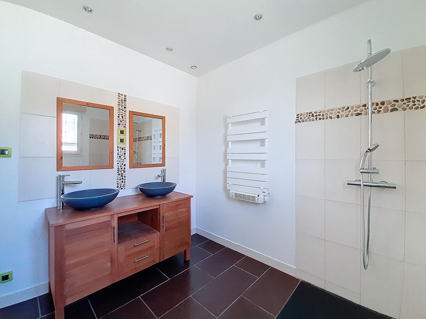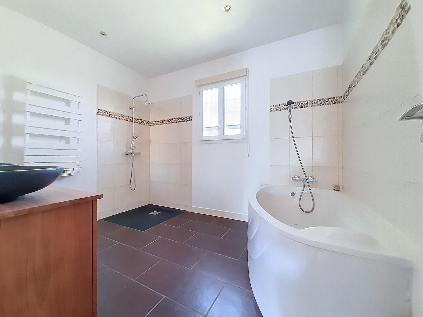 Elle offre une pièce de vie lumineuse avec cuisine ouverte aménagée et équipée, 3 chambres dont 2 en rez-de-chaussée, une salle de bains avec douche et baignoire et 2 WC.