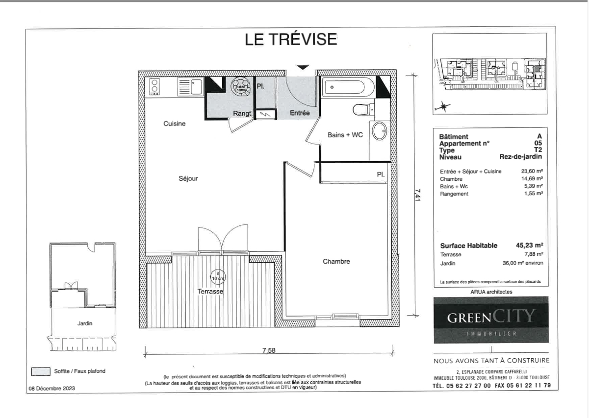 À l'extérieur, vous profiterez d'un jardin privatif de 36 m² ainsi que d'une terrasse de 7,88 m², idéals pour les moments de détente.