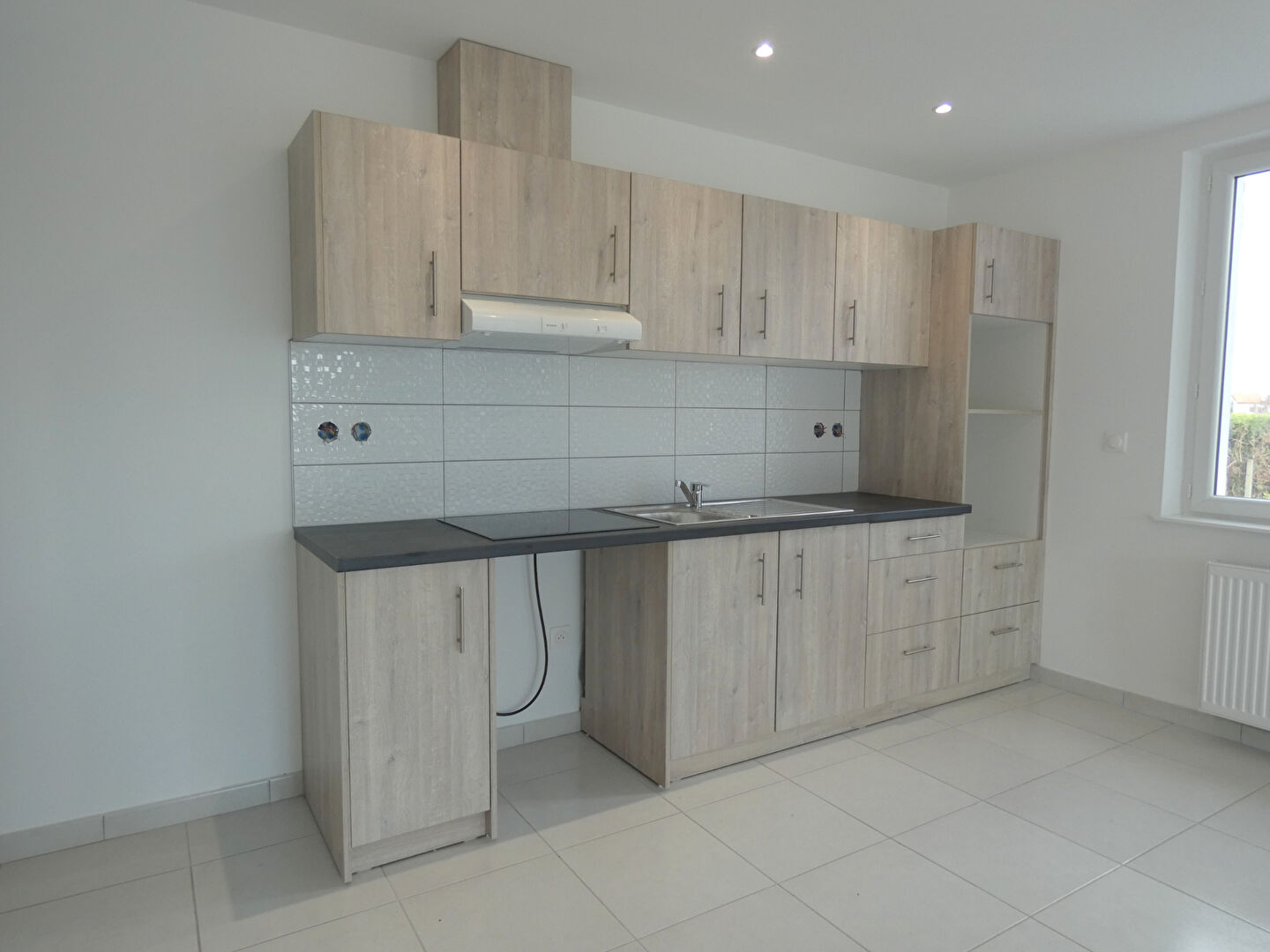 Villa comprenant une pièce de vie très lumineuse de 46 m² avec cuisine US neuve aménagée et équipée, trois chambres avec placard, salle d'eau neuve avec douche, buanderie, cellier, wc indépendant.
