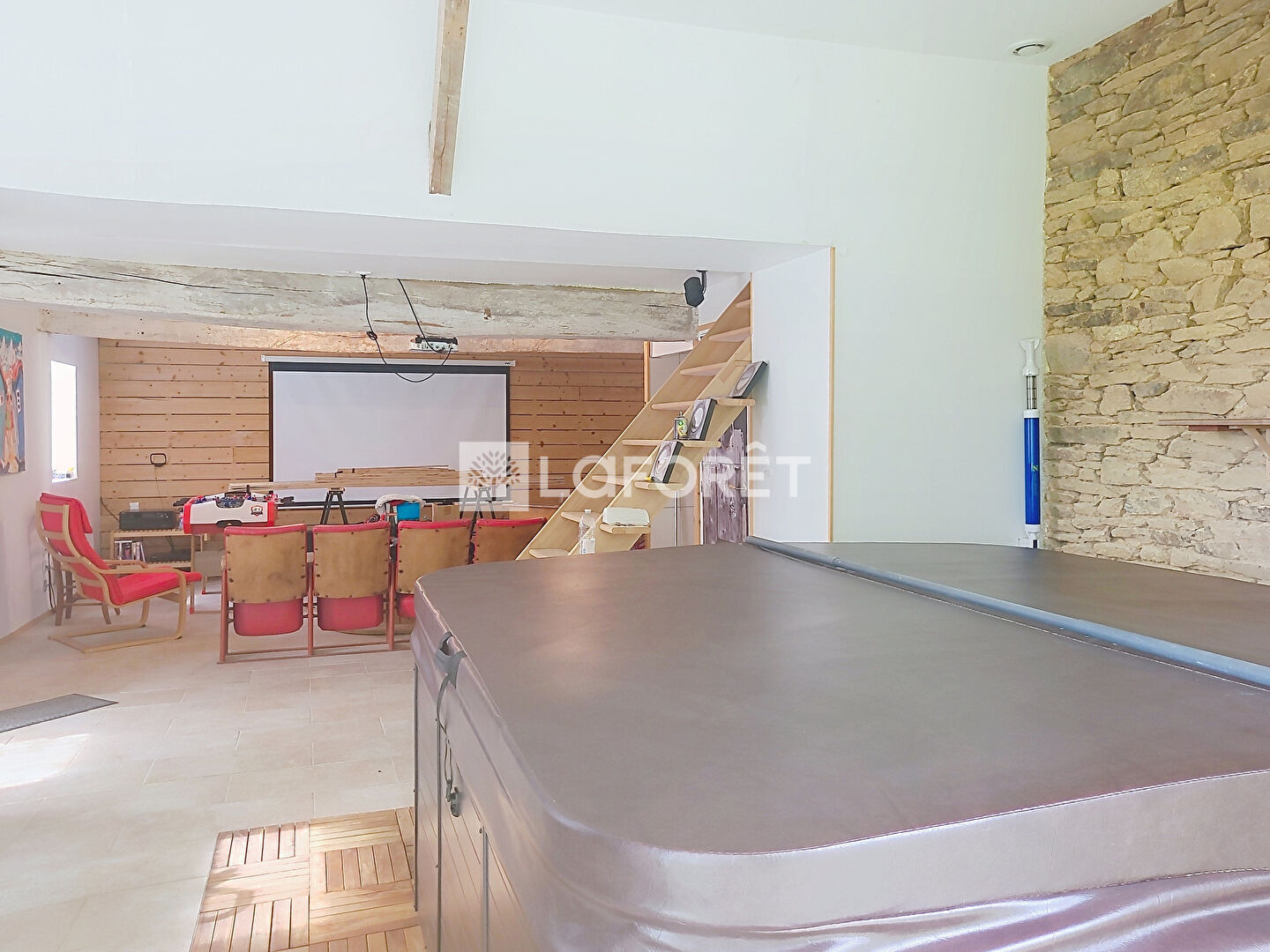 Un second bâtiment attenant accueille un véritable espace bien-être et loisirs, actuellement aménagé avec un SPA et une salle cinéma. Cet espace offre de nombreuses possibilités d'aménagement selon vos envies : salle de jeux, espace de réception, atelier ou lieu de détente. À l'étage, un grenier d'environ 40 m² au sol reste à aménager.
