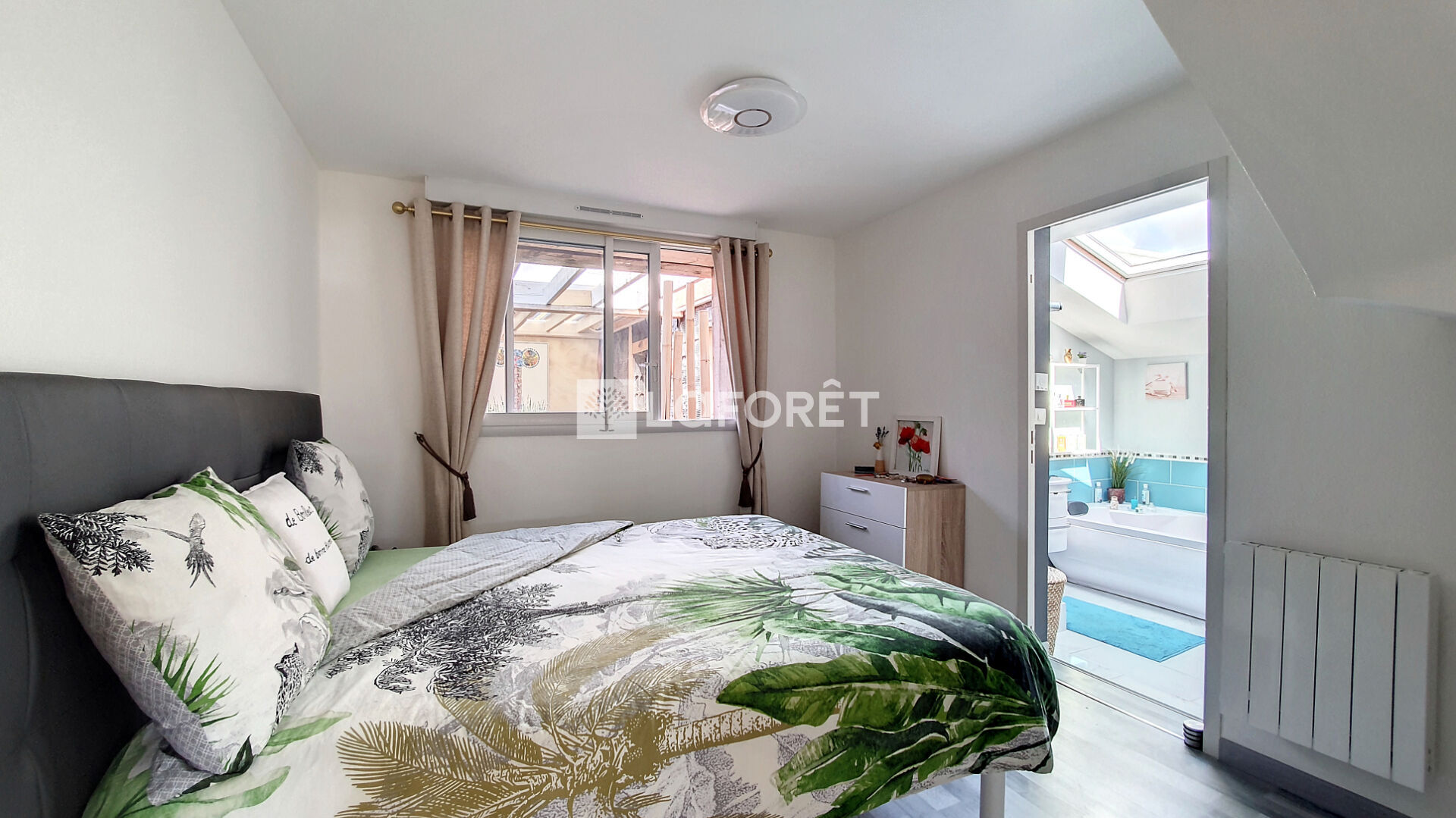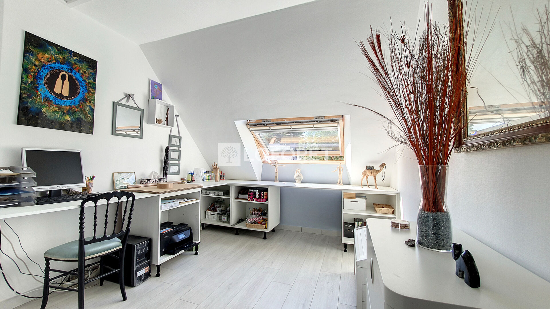 Une élégante mezzanine dessert deux chambres lumineuses avec parquet et une salle d'eau avec WC.