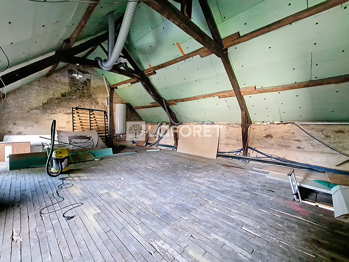 À l'étage, un grenier aménageable de 58 m² au sol offre un beau potentiel d'agrandissement. L'accès se fait actuellement par une trémie, il reste à installer un escalier.