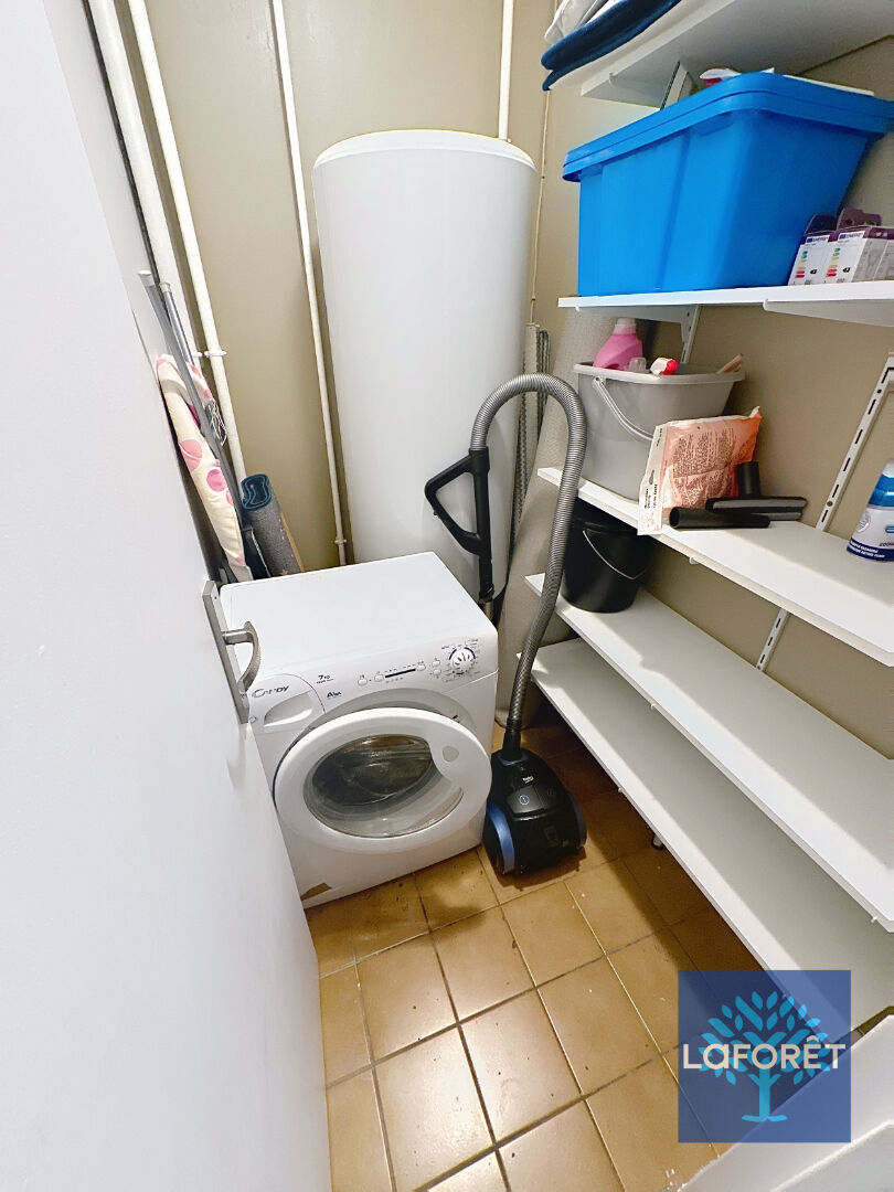 - Cellier équipé avec machine à laver et étagères pour un rangement optimisé.