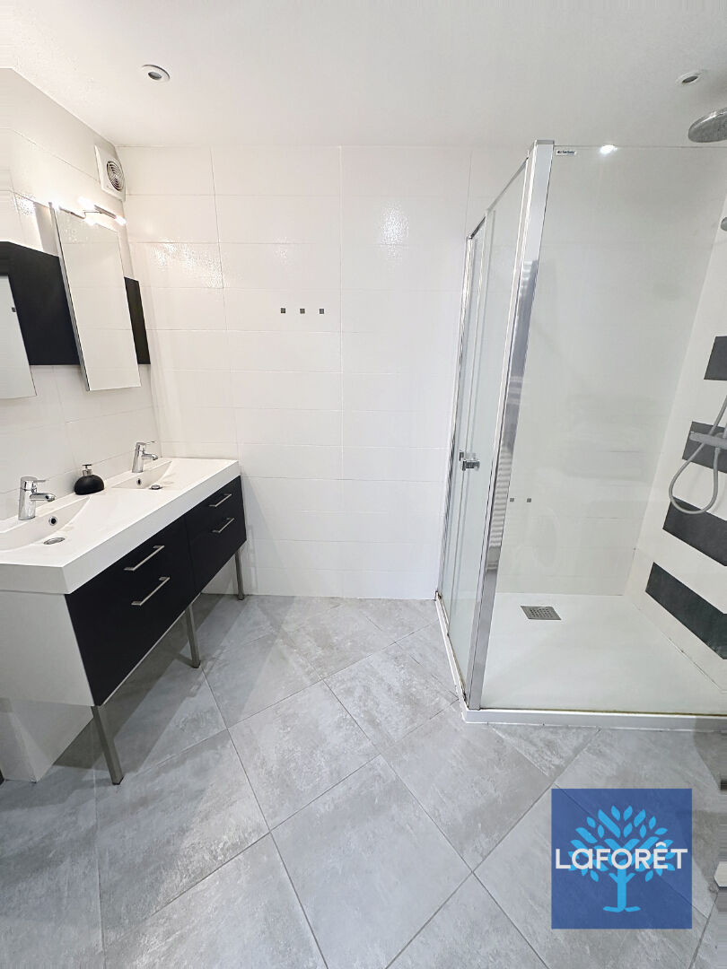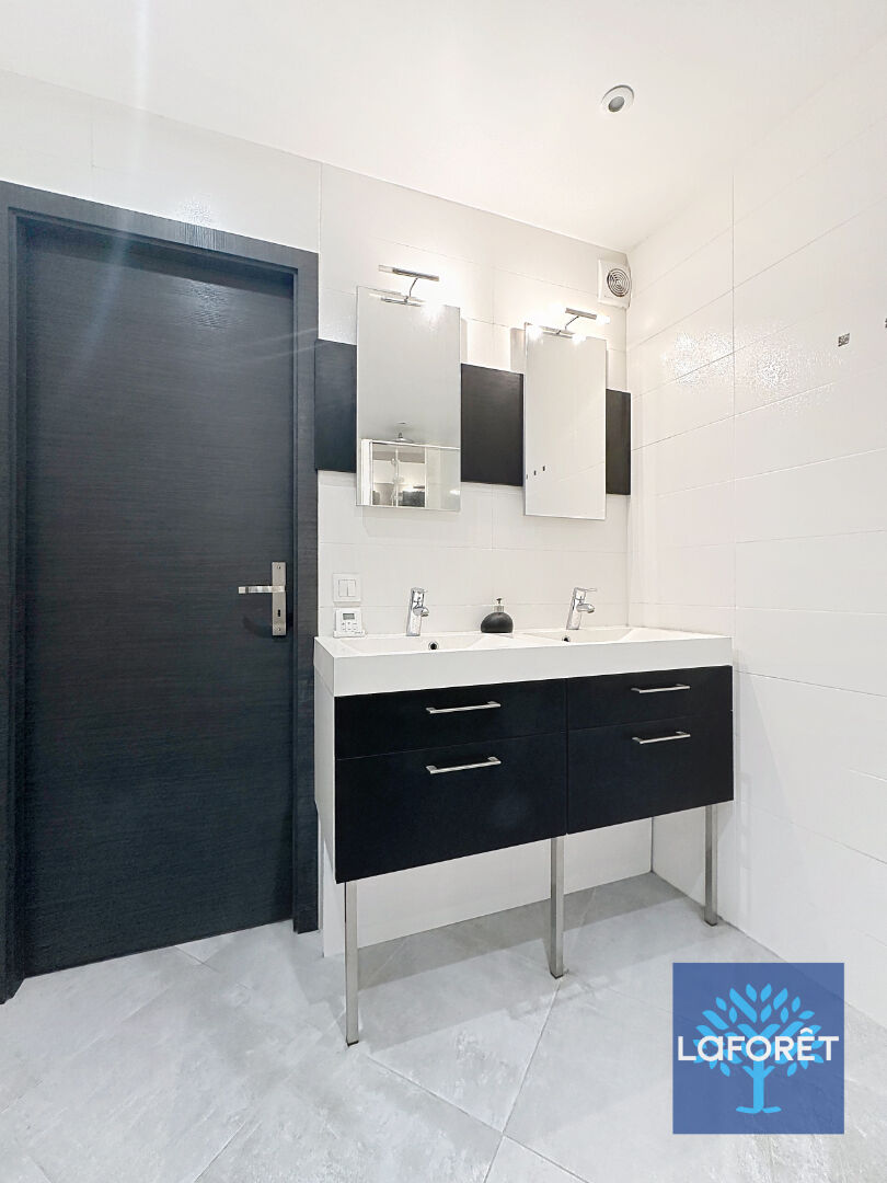 Une superbe salle d'eau moderne dotée d'une douche à l'italienne et de deux doubles vasques, associe esthétique et fonctionnalité, ainsi qu'un premier WC indépendant.