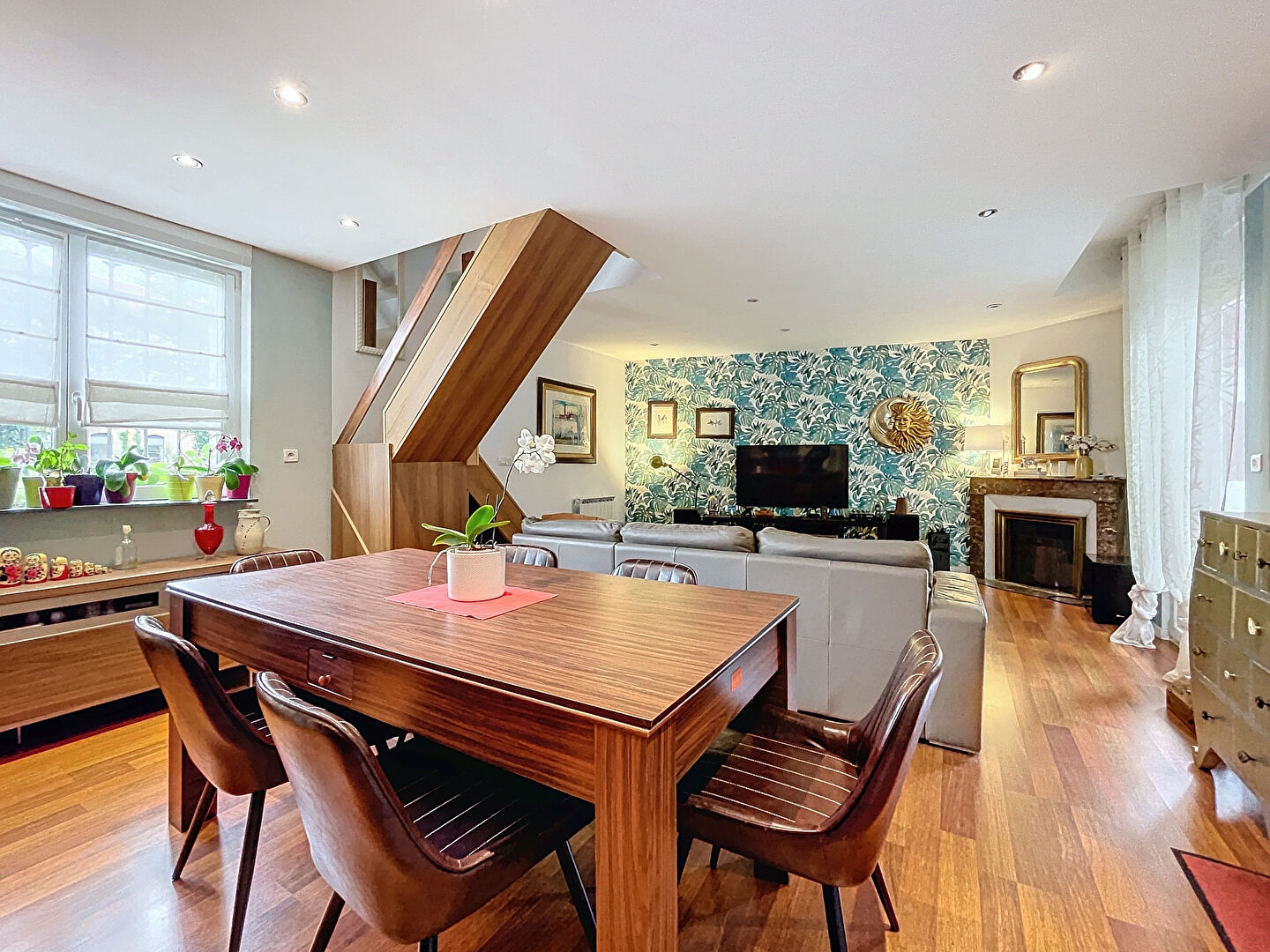 Composée au rez-de-chaussée d'une belle pièce de vie avec cuisine équipée donnant accès à un jardinet et une terrasse préservés du vis-à-vis par la présence d'un grand cerisier, d'une grande pièce de vie avec cuisine ouverte équipée, une chambre parentale (env. 17 m2), une seconde chambre (env. 14.5m2), une salle de bains, un espace bureau, un coin buanderie.