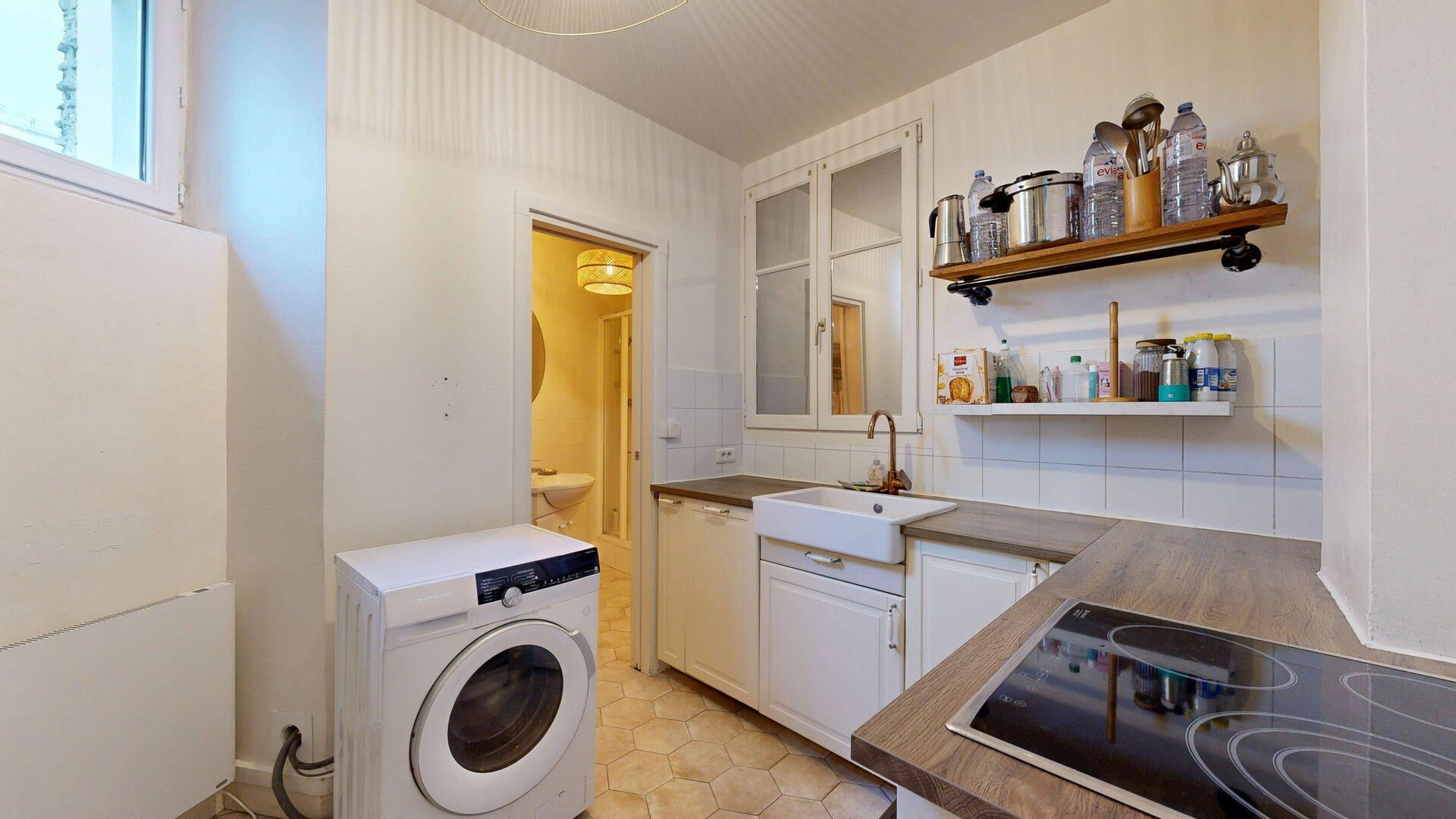 Ce T2 offre une entrée donnant sur un séjour avec une cuisine entièrement équipée avec coin dinatoire, une chambre avec cheminée ancienne, une salle d'eau et un WC.