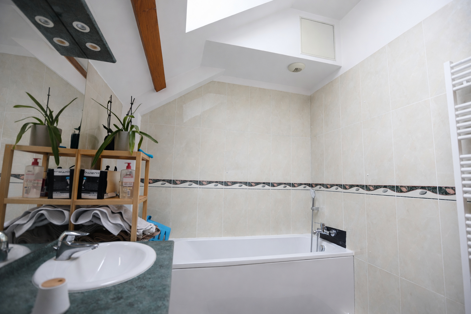 La maison principale développe environ 77 m² habitables. Entièrement rénovée en 2006, elle a bénéficié d'un rafraîchissement complet en 2023 et se présente aujourd'hui dans un excellent état général, sans travaux à prévoir. L'agencement est fonctionnel et lumineux, avec une cuisine ouverte sur le séjour au rez-de-chaussée, accompagnée d'une salle de bains avec WC. L'étage accueille trois chambres ainsi qu'une seconde salle de bains avec WC.