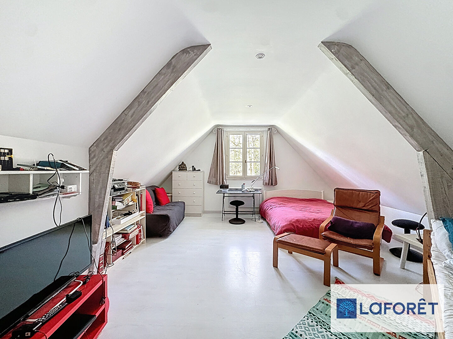 À l'étage, un palier dessert trois chambres, une salle de bains avec WC, ainsi qu'un vaste espace de plus de 37 m² laissant de nombreuses possibilités d'aménagement (chambre supplémentaire, suite, espace bureau ou salle de loisirs).