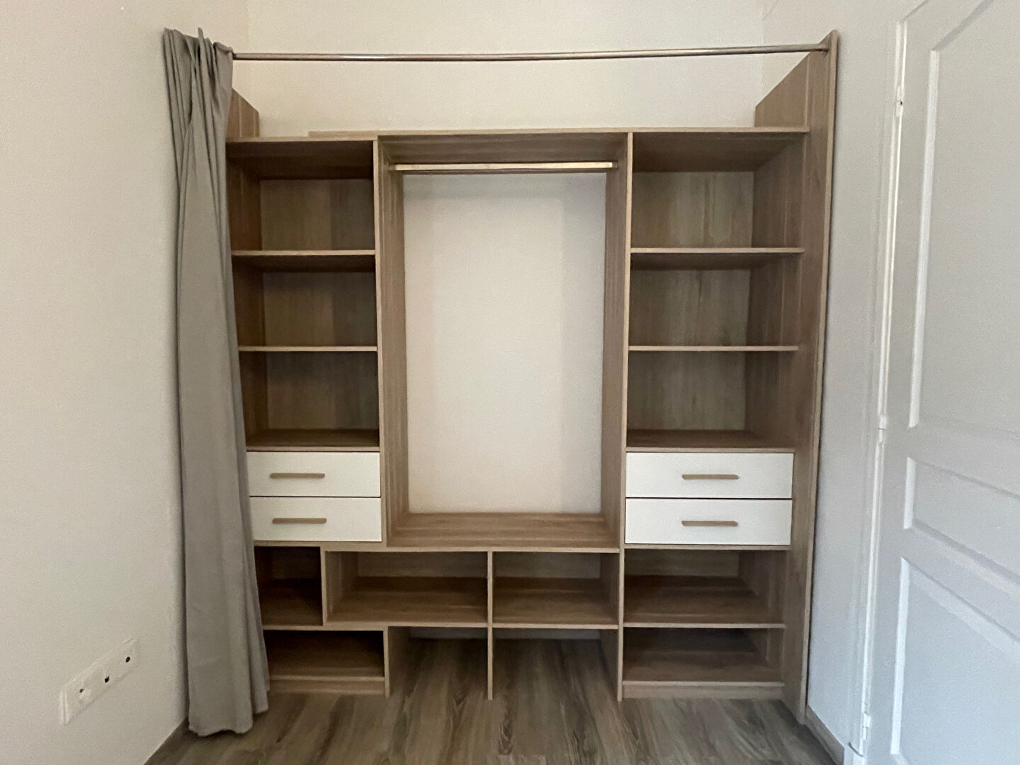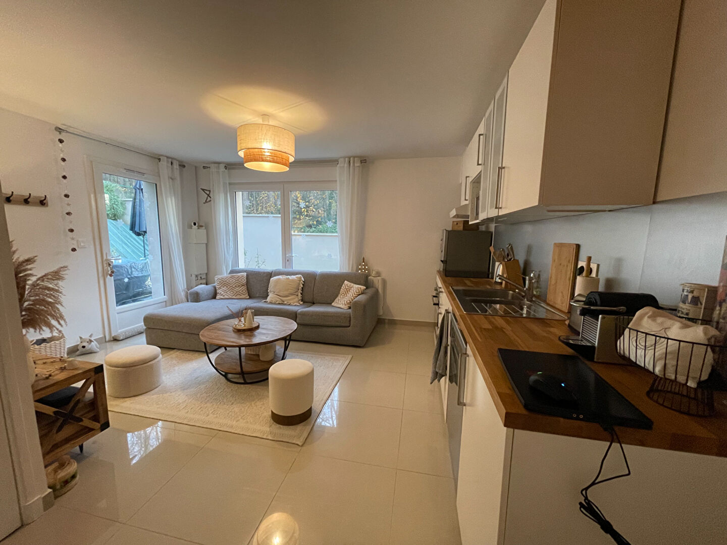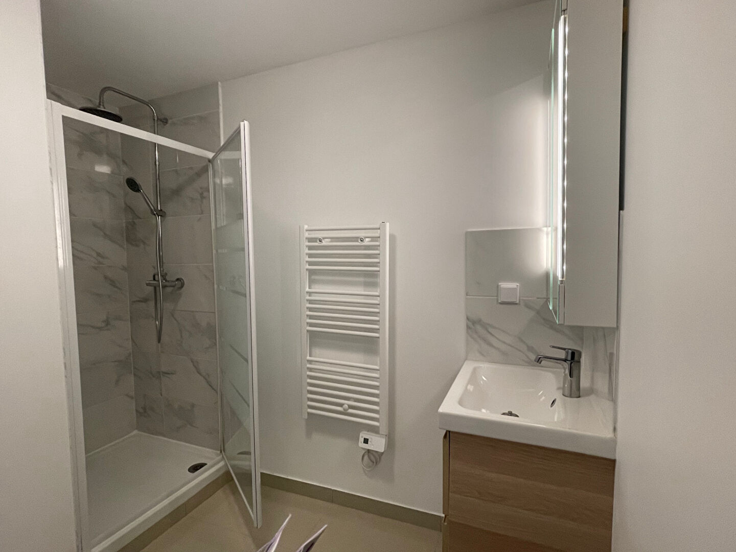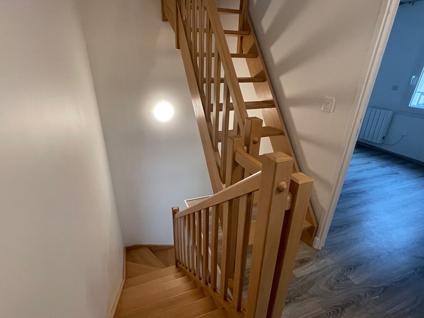 Au rez-de-chaussée, vous trouverez une entrée donnant sur un séjour lumineux avec cuisine équipée (hotte et plaque de cuisson), ainsi qu'une salle de douche avec WC PMR, dotée d'un meuble sous-vasque, d'un meuble de rangement et d'un miroir rétro-éclairé.