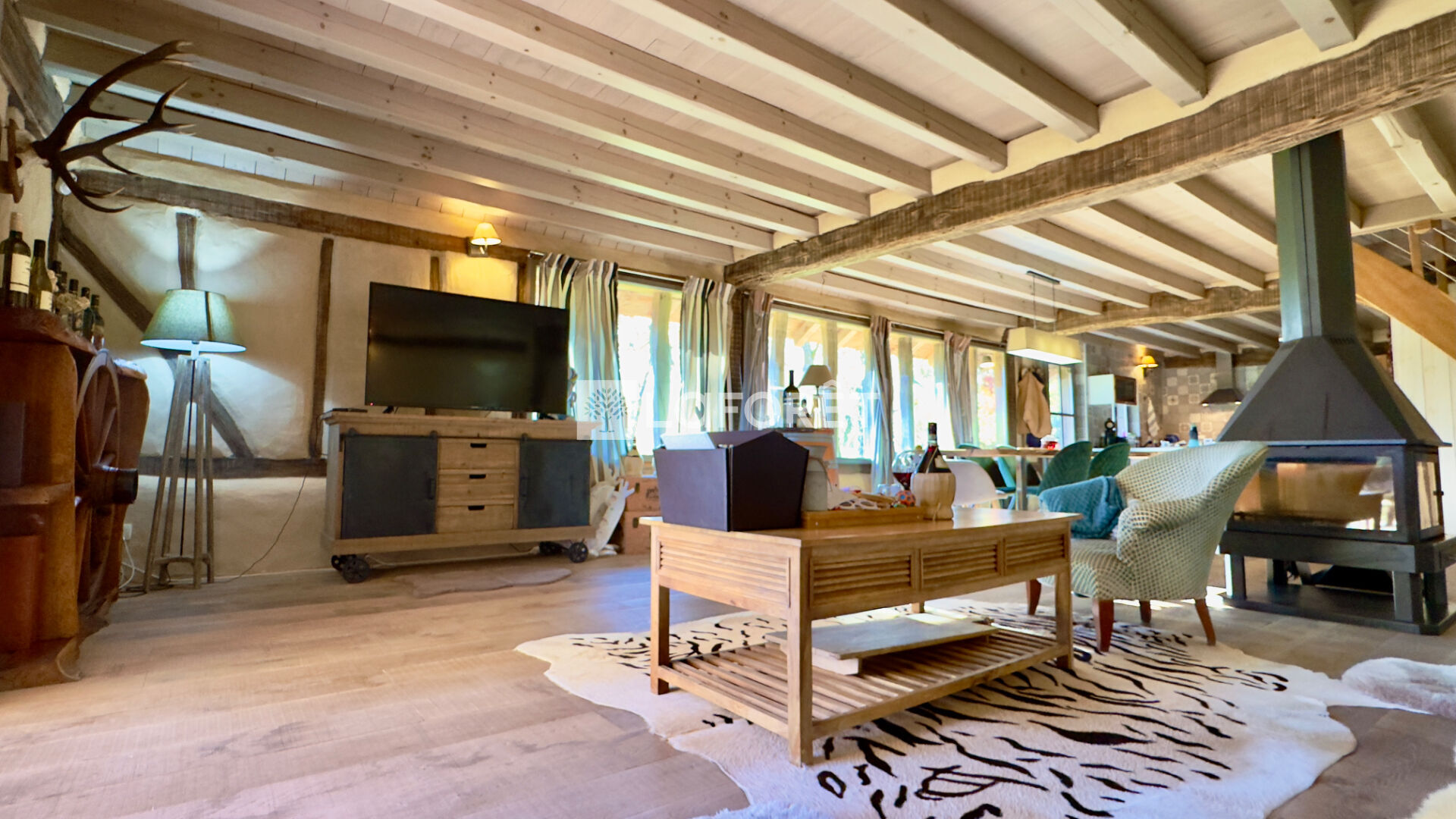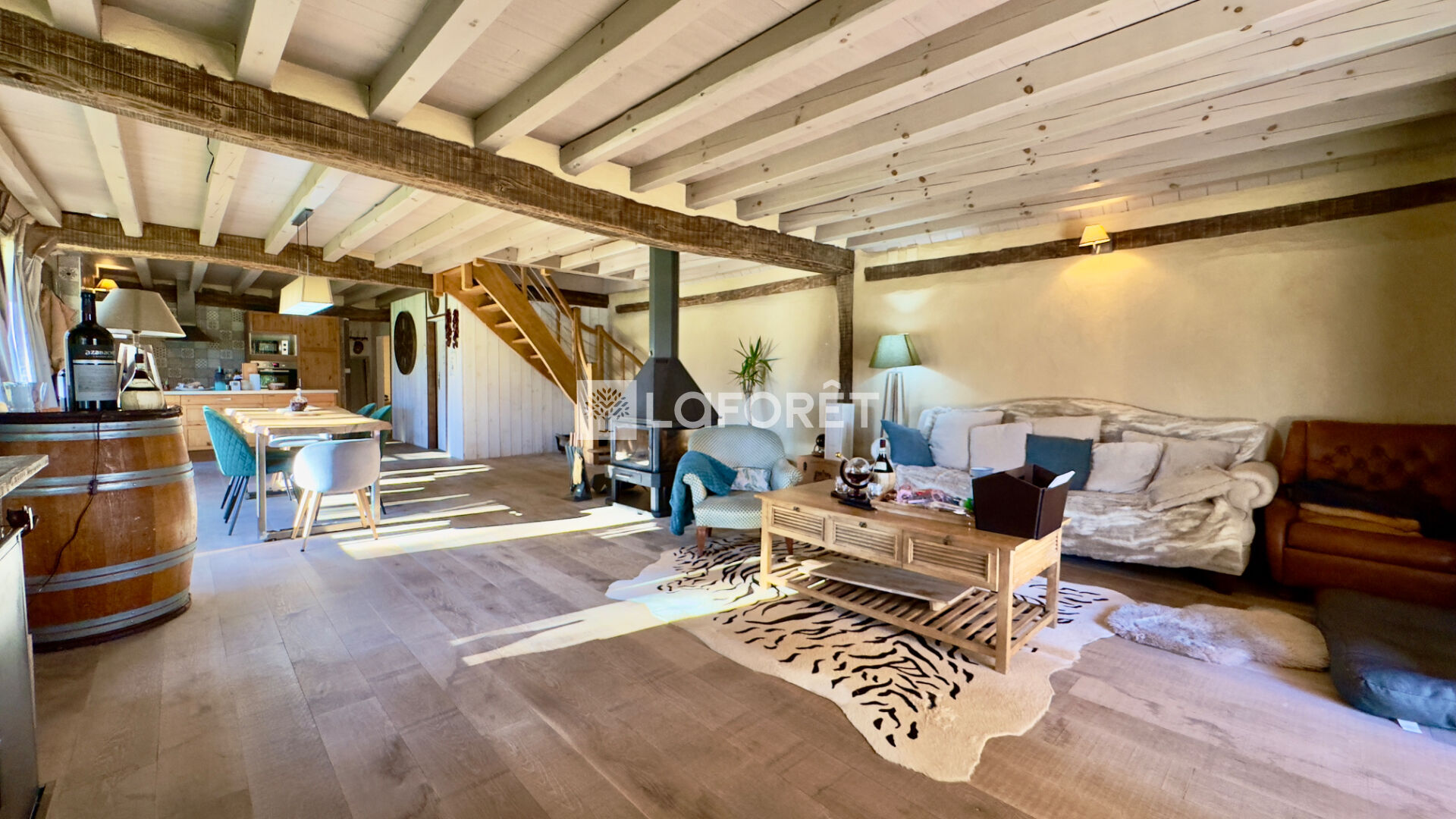 Elle développe environ 170 m² habitables et propose une vaste pièce de vie d'environ 80 m² avec séjour et cuisine ouverte, lumineuse et fonctionnelle. Cet espace bénéficie d'un chauffage au sol alimenté par une pompe à chaleur, complété par un poêle à bois central multiface, apportant confort et convivialité.