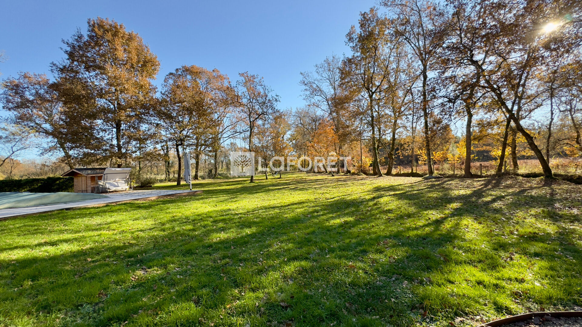 À l'extérieur, une terrasse en bois donne accès à la piscine et à son pool house, dans un environnement naturel sans vis-à-vis.