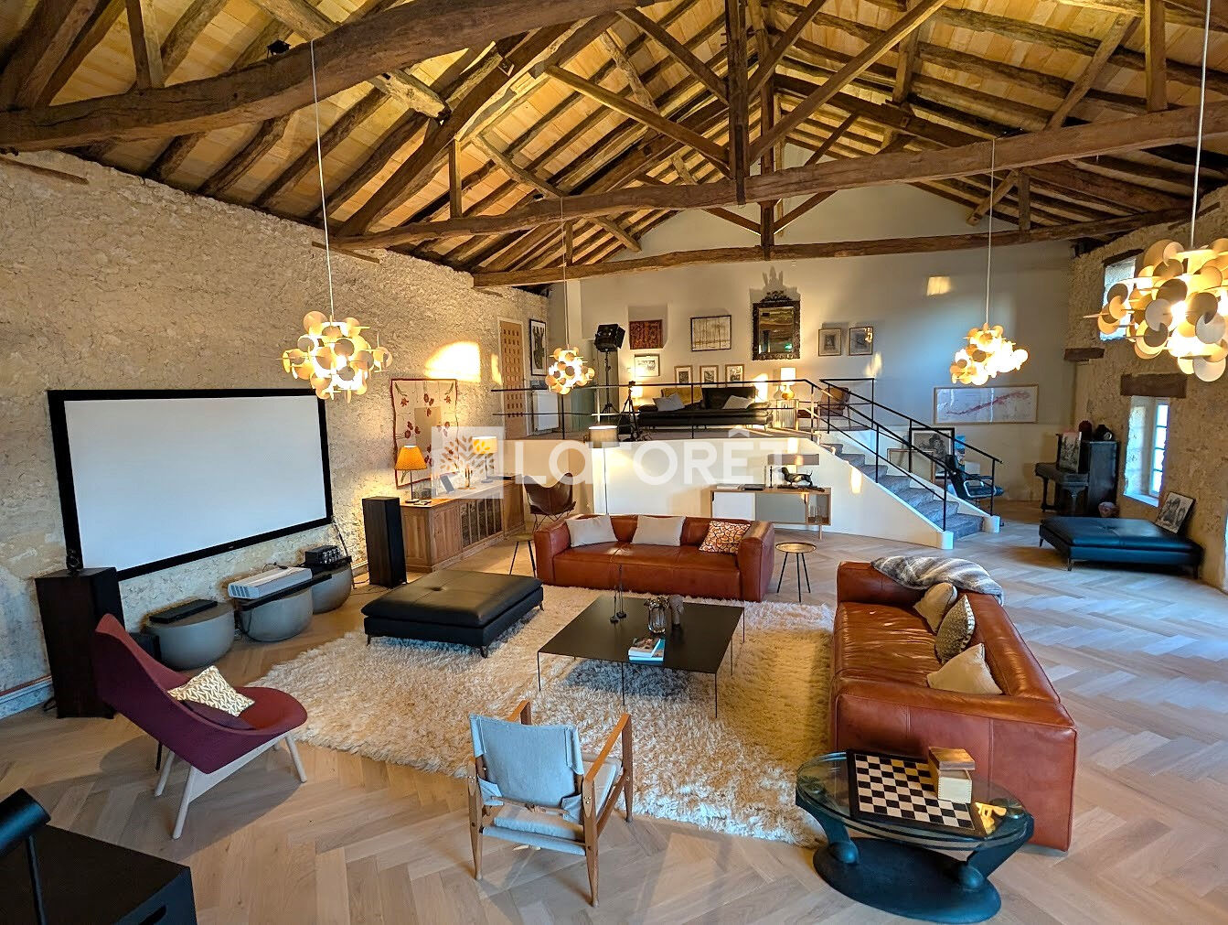 Le grand salon de 180m², ancien chai transformé, séduit par ses volumes et ses trois espaces distincts : un petit salon cosy, un grand salon pour recevoir et un coin billard pour des moments de détente. Deux mezzanines et un double escalier ajoutent une touche unique à cet espace.
