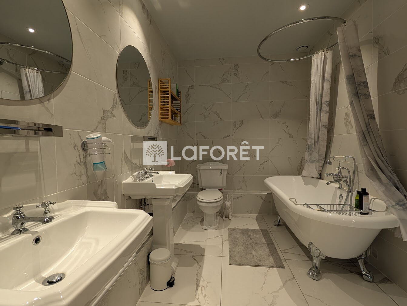 L'étage propose trois chambres lumineuses, dont une avec un dressing. Une salle d'eau avec douche, double vasque et WC est partagée entre deux chambres, tandis que la suite parentale dispose de sa propre salle de bains avec baignoire, WC et dressing.