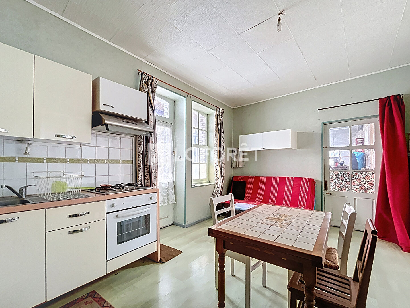 Cette maison se compose au rez-de-chaussée d'une entrée, une cuisine de 21m² avec cuisinière à bois et une arrière cuisine, une pièce à vivre de 20m², une salle de bains de 5m² et un toilette séparé.