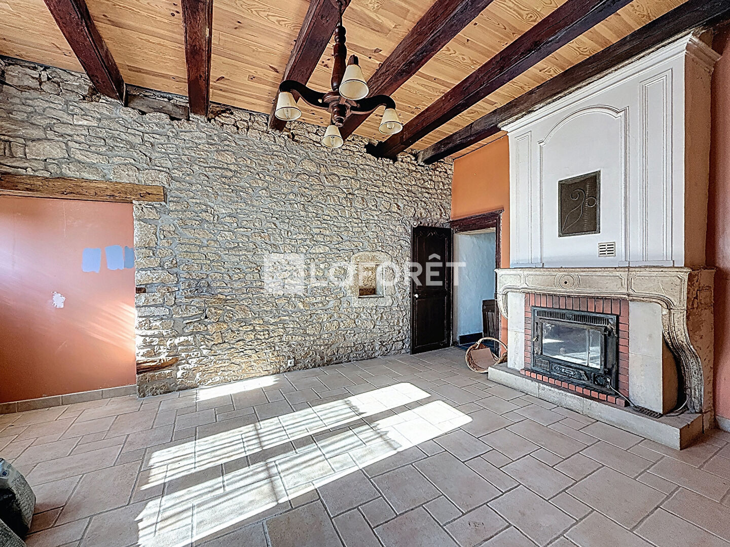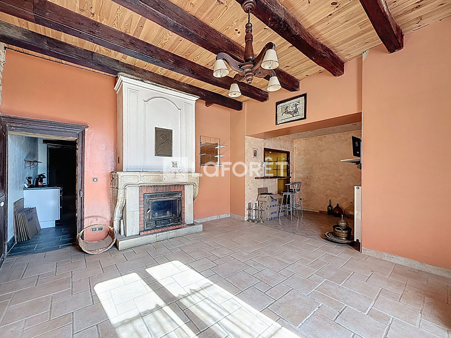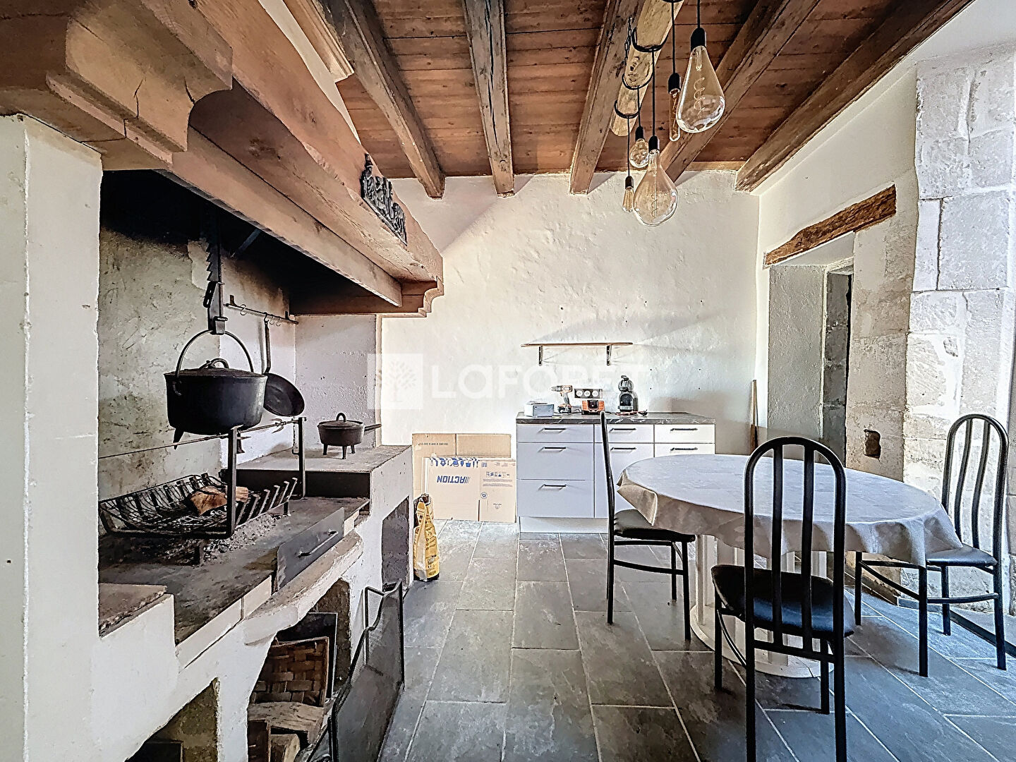 Au rez-de-chaussée : un séjour lumineux avec pierres et poutres apparentes, accompagné d'un coin bar, une cuisine moderne avec cheminée à foyer ouvert, une salle de bains avec douche en travertin, un toilette séparé, un atelier, une cave ainsi qu'un espace chaufferie.