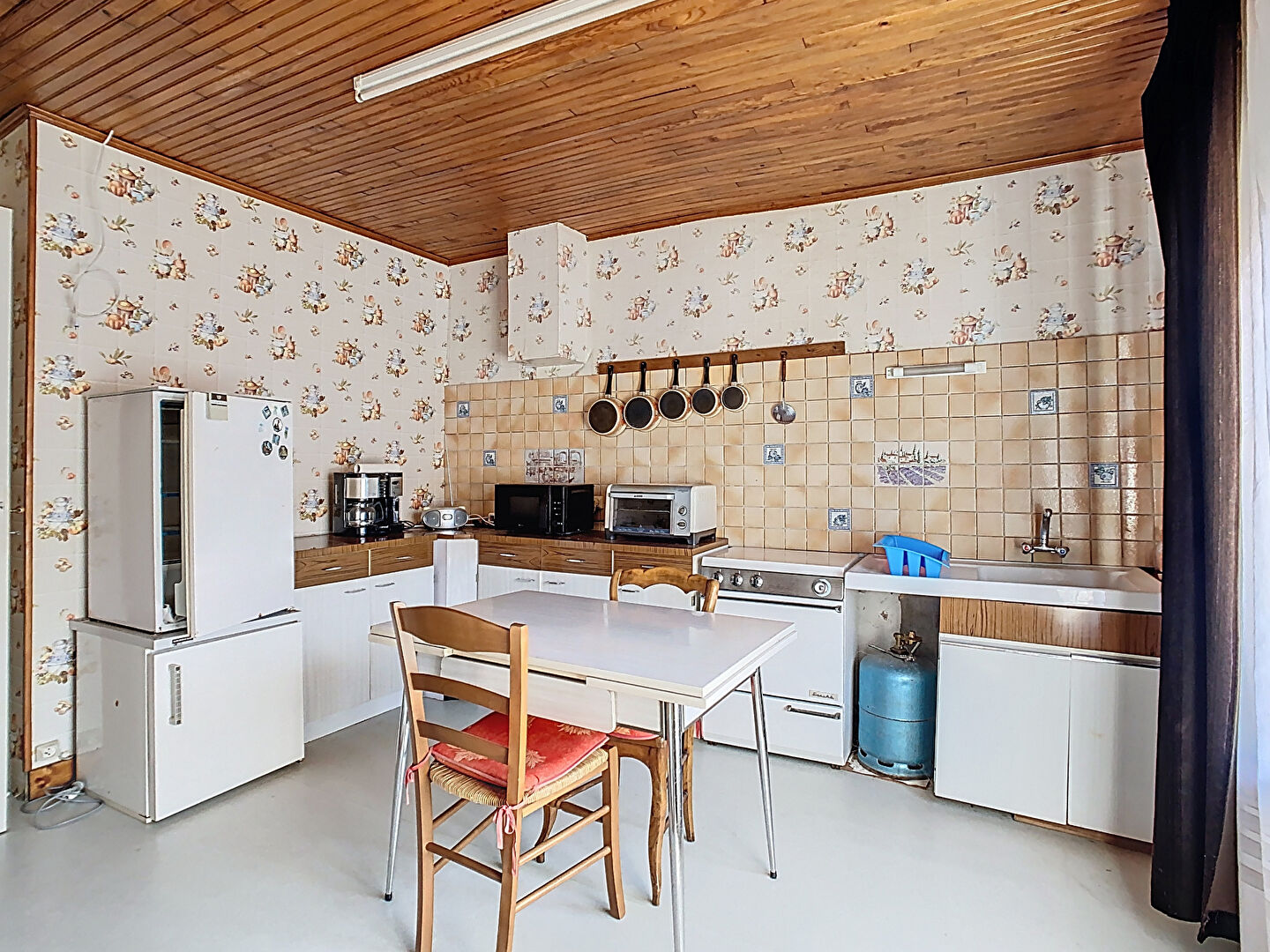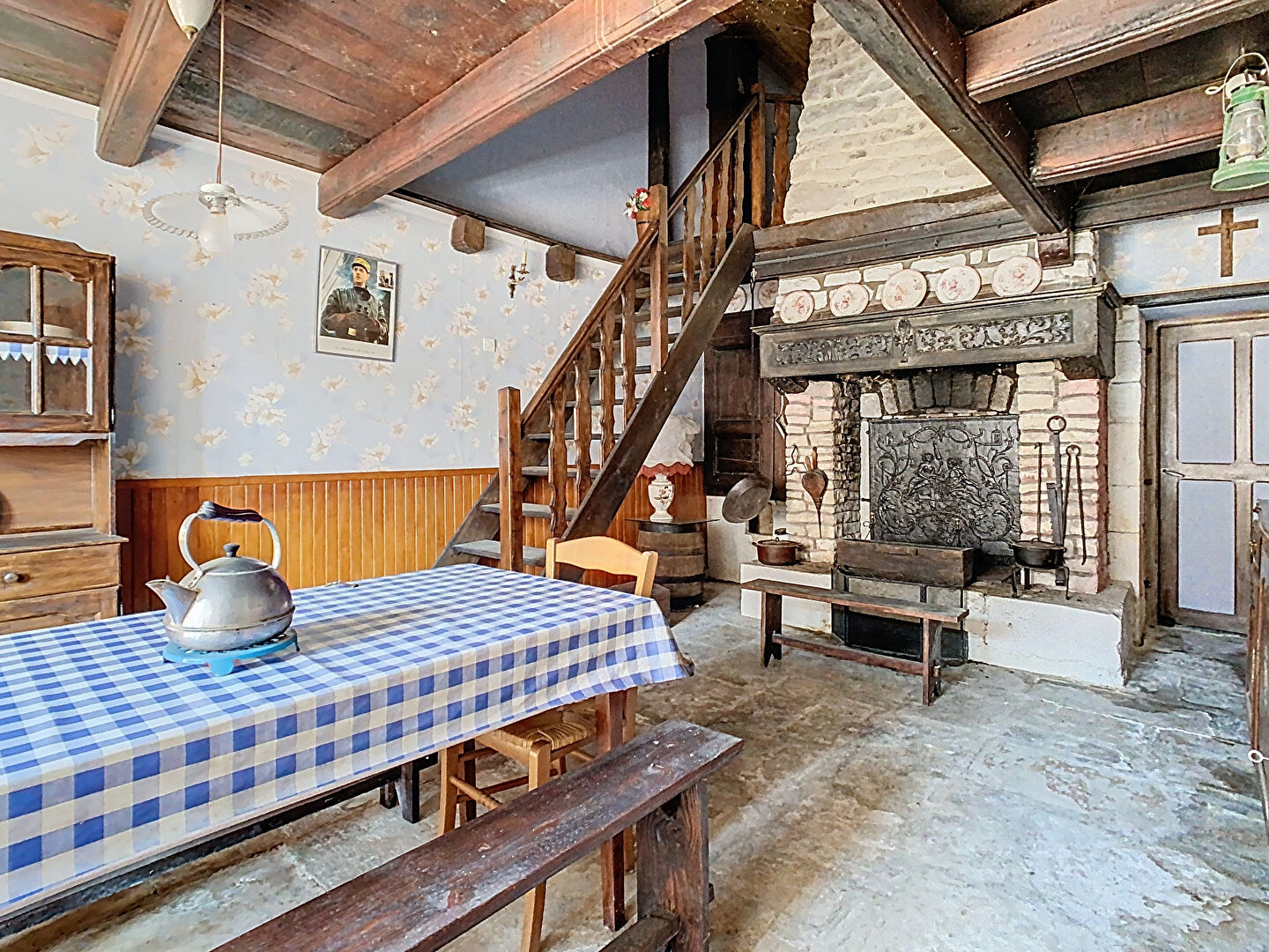 Sas d'entrée, cuisine simple de 20m² avec cheminée à l'âtre, une pièce à rénover pouvant faire office de salle à manger ou salon et une salle d'eau avec toilette.