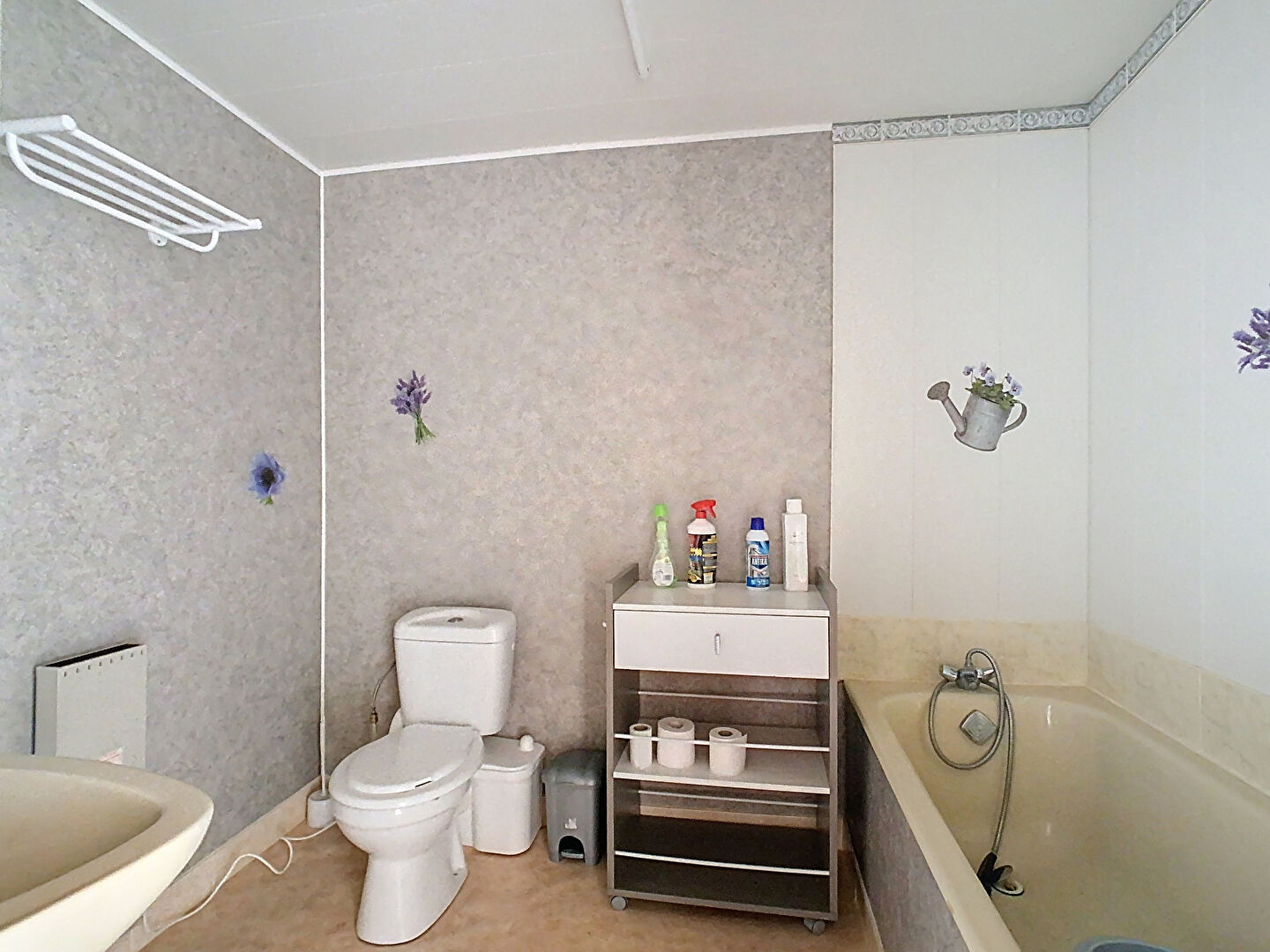 A l'étage un palier dessert deux chambres, une cuisine aménagée, un salon donnant accès à la terrasse, une pièce borgne, une salle de bains, un cagibis et un toilette sanibroyeur séparé.