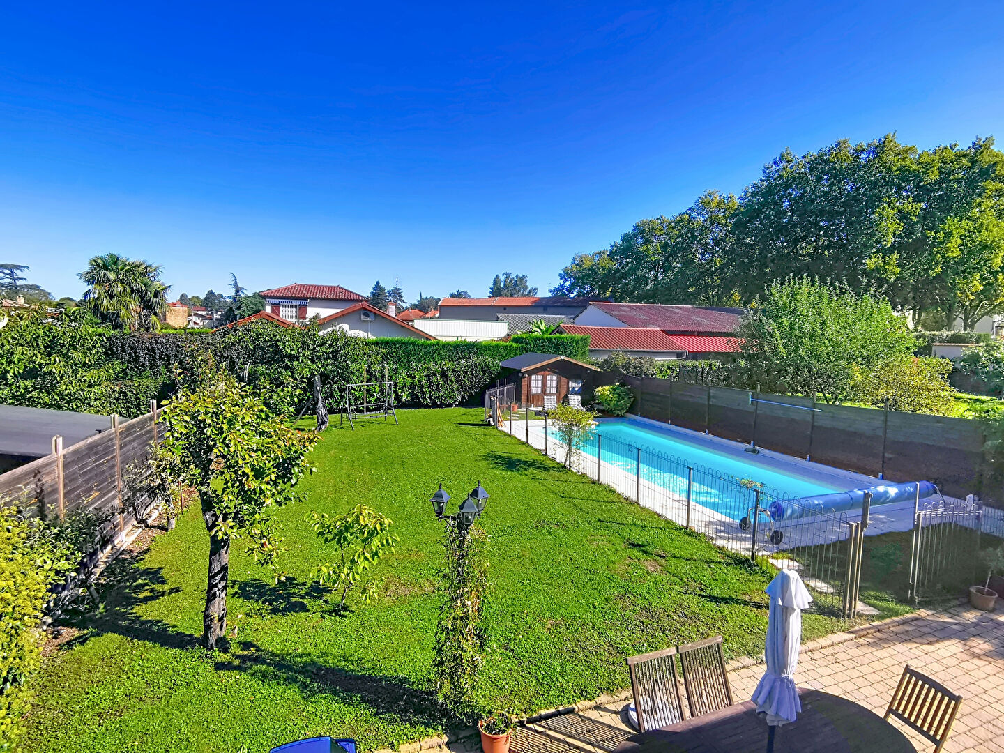 La terrasse et la piscine chauffée (11 m x 4,5 m) complètent ce cadre accueillant.
