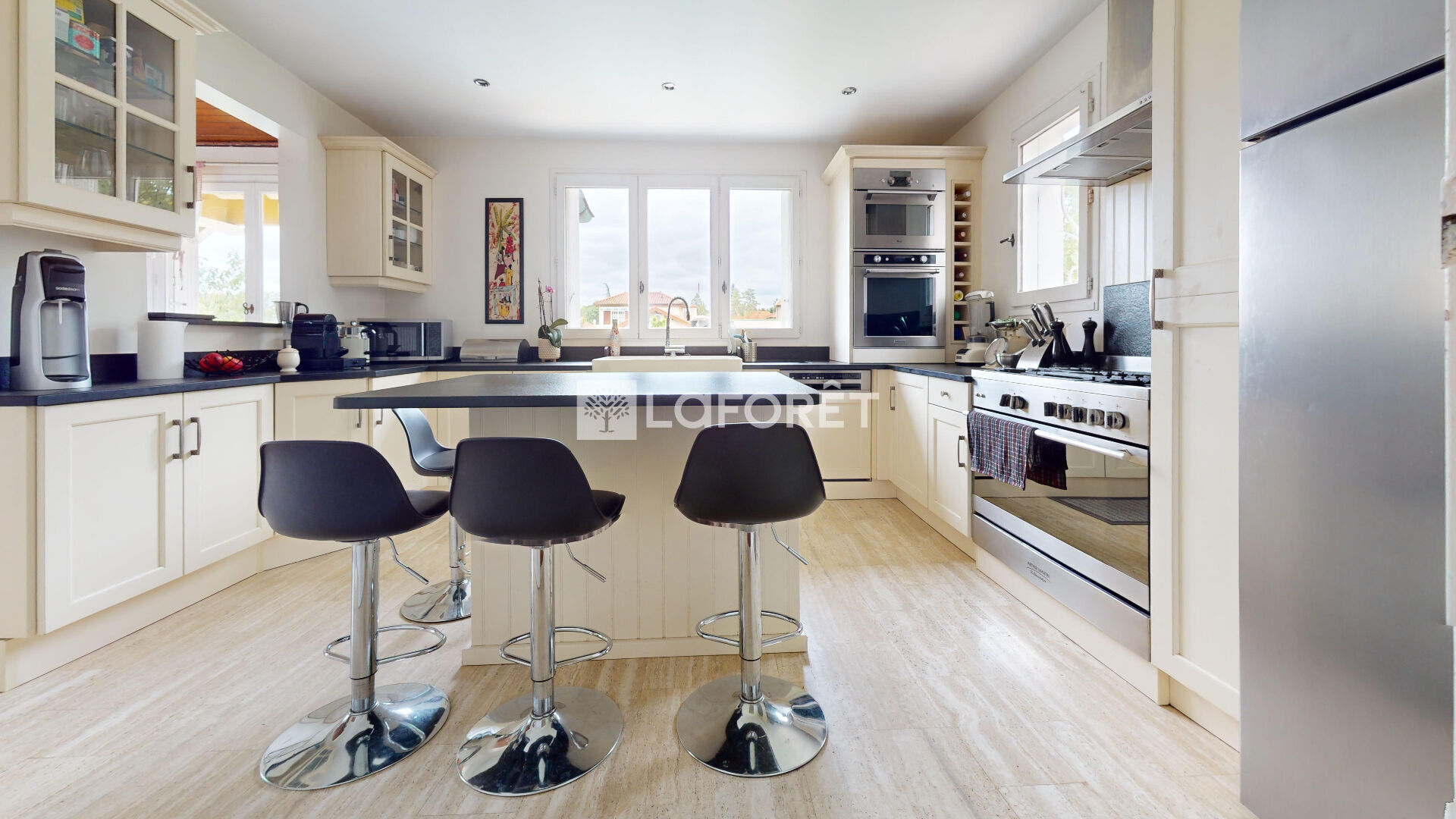 * Cuisine équipée de qualité : sol en travertin, meubles en chêne Chabert Duval, îlot central avec plan de travail en granit Zimbabwe. Semi-ouverte sur la salle à manger avec accès direct pour descendre dans le jardin avec sa terrasse et piscine.