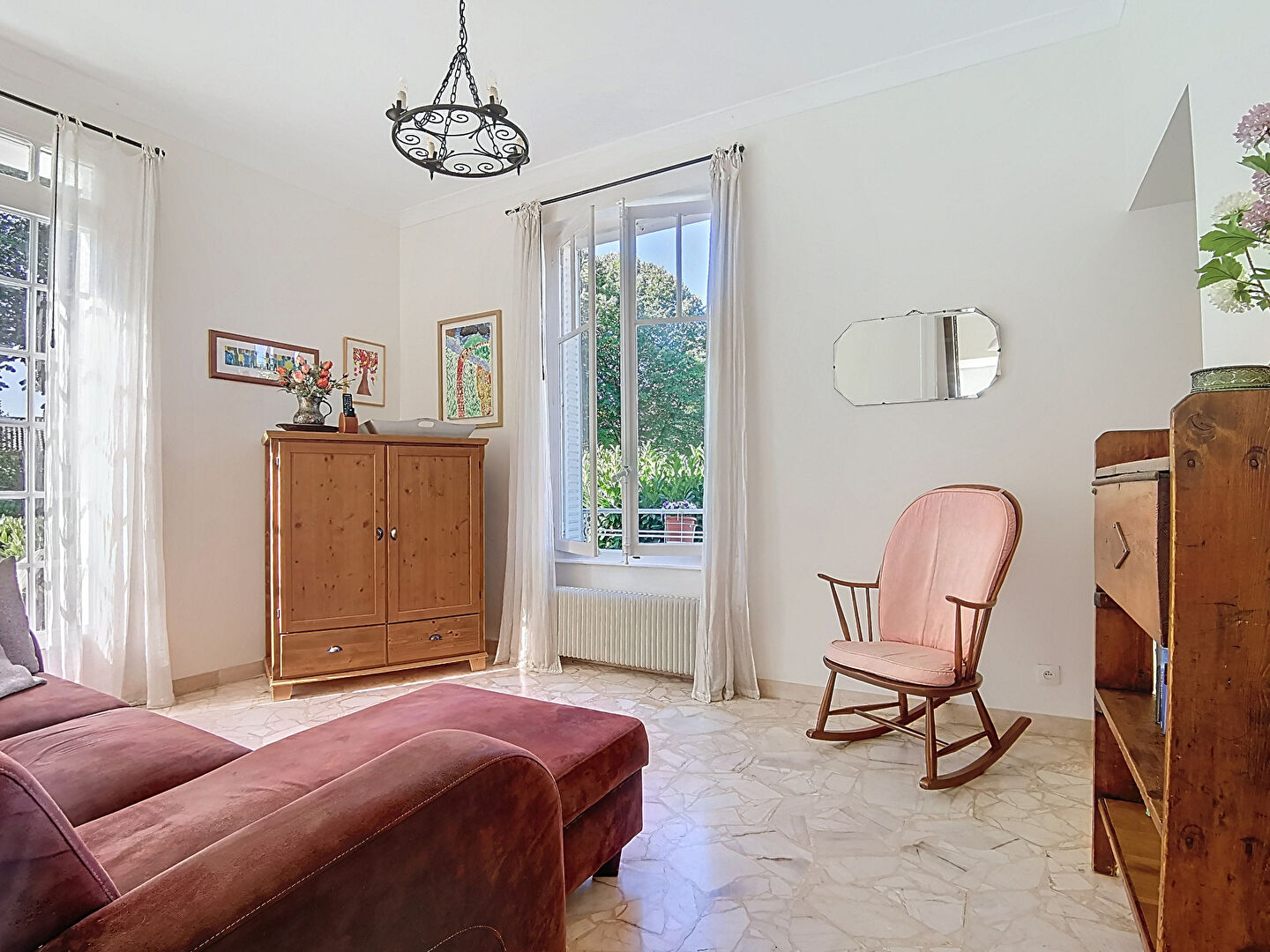 * Salon de lecture avec sols en marbre, baigné de lumière, ouvrant directement sur une terrasse avec vue sur les Monts d'Or.