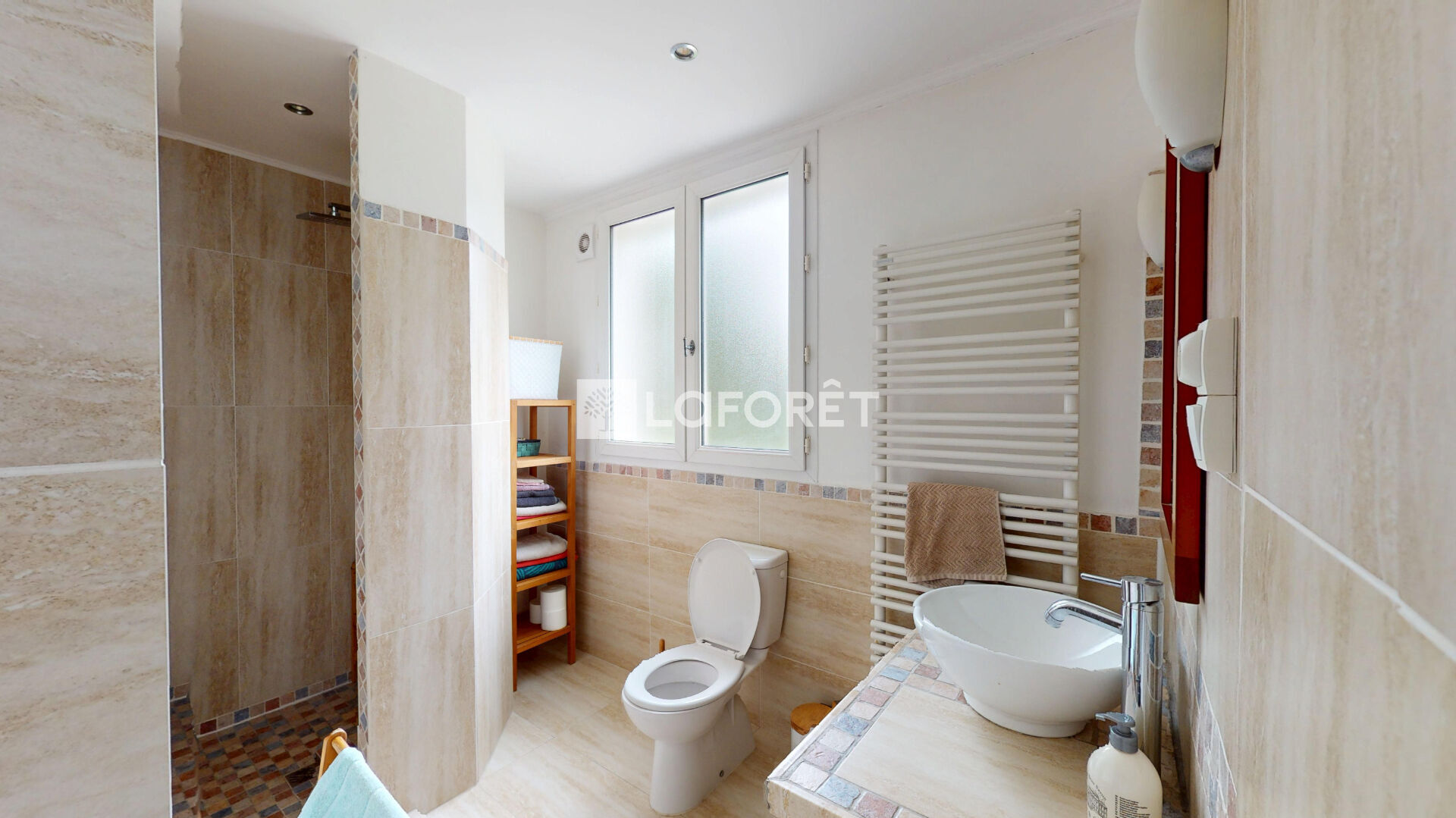 * Salle d'eau avec sol en style de travertin et douche en pierre naturelle.