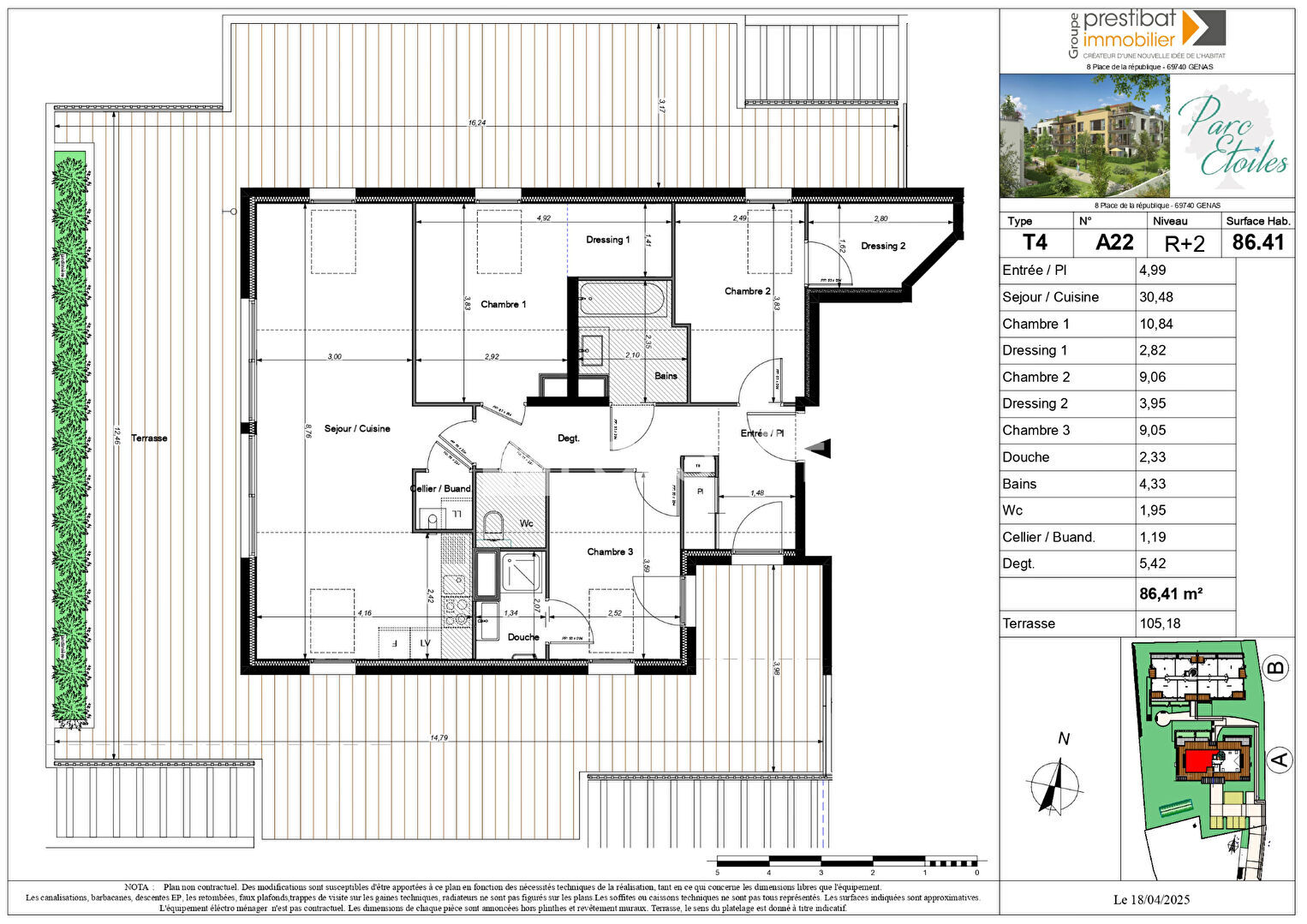 À découvrir dans un nouveau programme immobilier à Genay, ce bel appartement T4 de 86 m² situé au sein d'une résidence moderne et intimiste, au dernier étage comprenant une terrasse entourant l'appartement sur trois expositions , de 105.18 m²