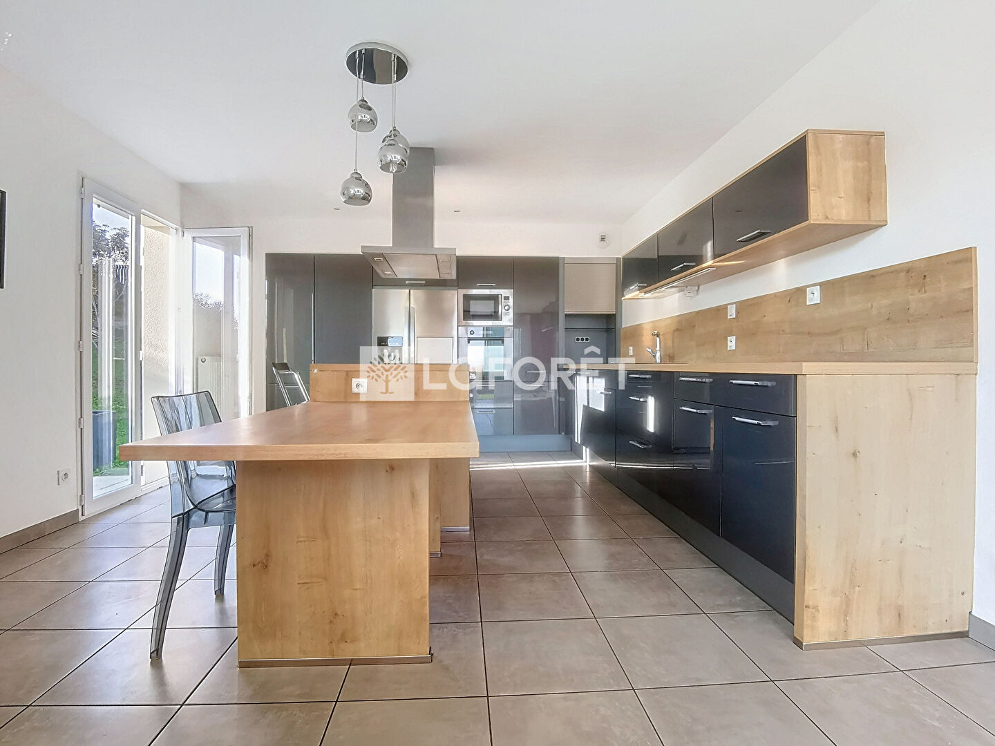 * Généreuse cuisine ouverte entièrement équipée (marque Ixina), avec électroménager intégré, nombreux rangements et grand îlot central convivial