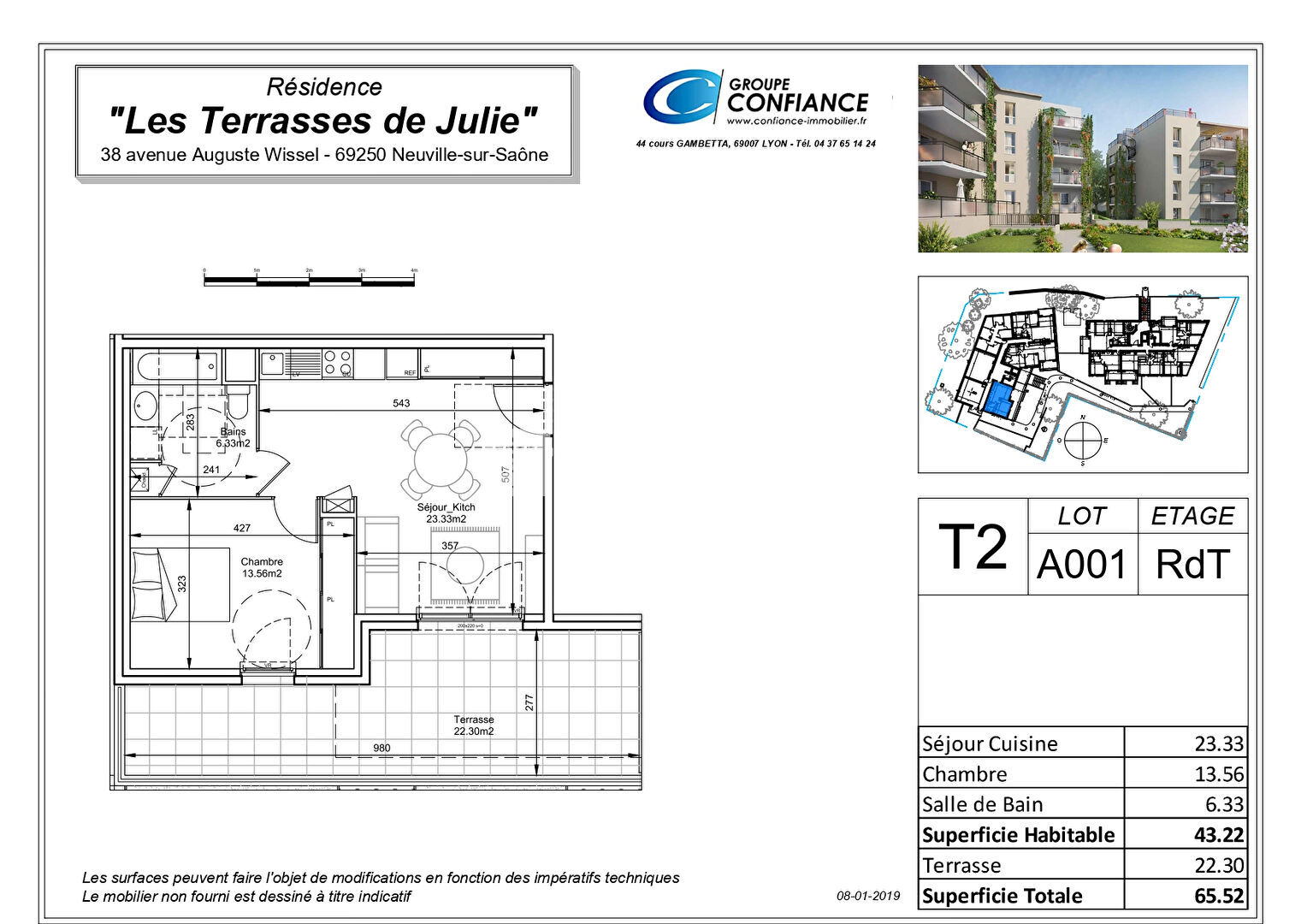 A001 LES TERRASSES DE JULIE :BENEFICIEZ D'UNE MAGNIFIQUE TERRASSE AU CALME DE 22M² POUR CE BEAU T2 EN REZ DE CHAUSSE DE PLUS DE 43M² - DONNANT SUR L'INTERIEUR D'UNE RESIDENCE NEUVE BBC DE STANDING L'appartement se compose d'un beau séjour de 23m² avec cuisine ouverte équipée et meublée (hotte, plaques vitro, four, meubles haut et bas), une superbe grande chambre de près de 14m² avec grand placard mural et sol parquet,