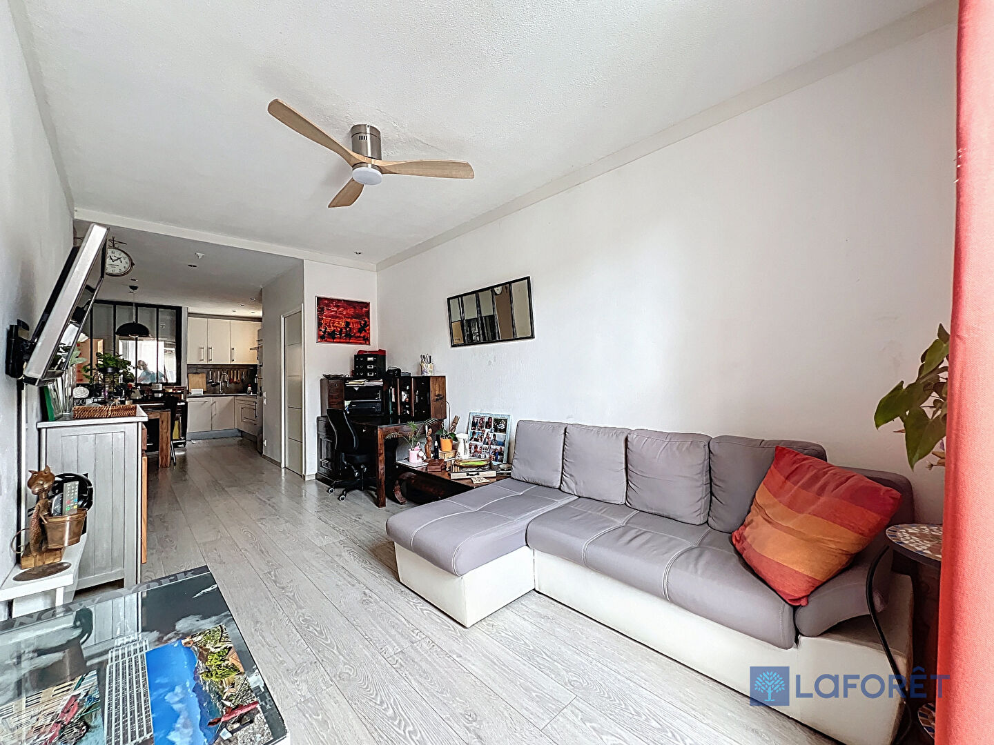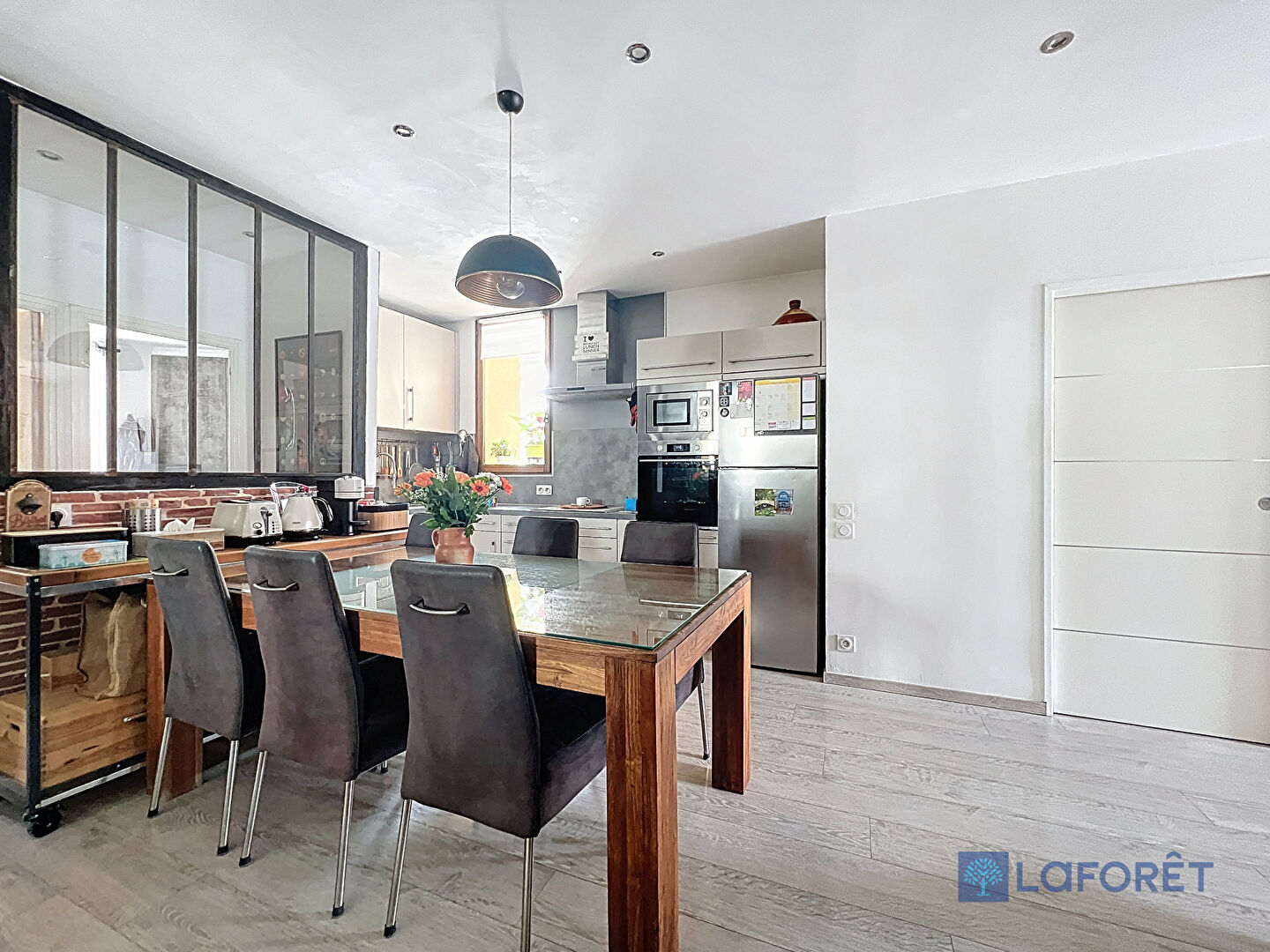 La pièce de vie, chaleureuse et baignée de lumière, s'ouvre sur un balcon et communique avec une cuisine équipée avec espace repas, créant un lieu de vie convivial et fonctionnel au quotidien comme pour recevoir.
