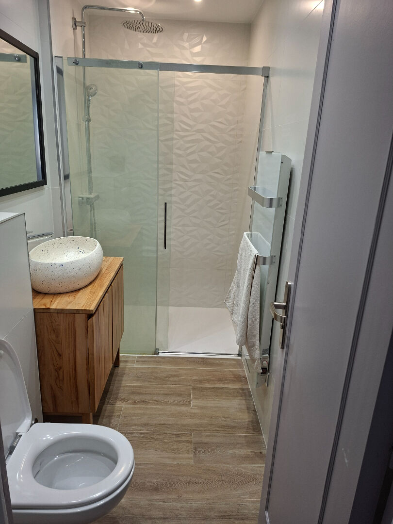 une chambre principale avec vue mer,une seconde chambre disposant de sa salle de d eau avec toilette privatifs,une troisième chambre ,ideale pour un bureau ou une chambre d enfant .La cuisine séparée entièrement aménagée et équipée,offre confort et praticité au quotidien .