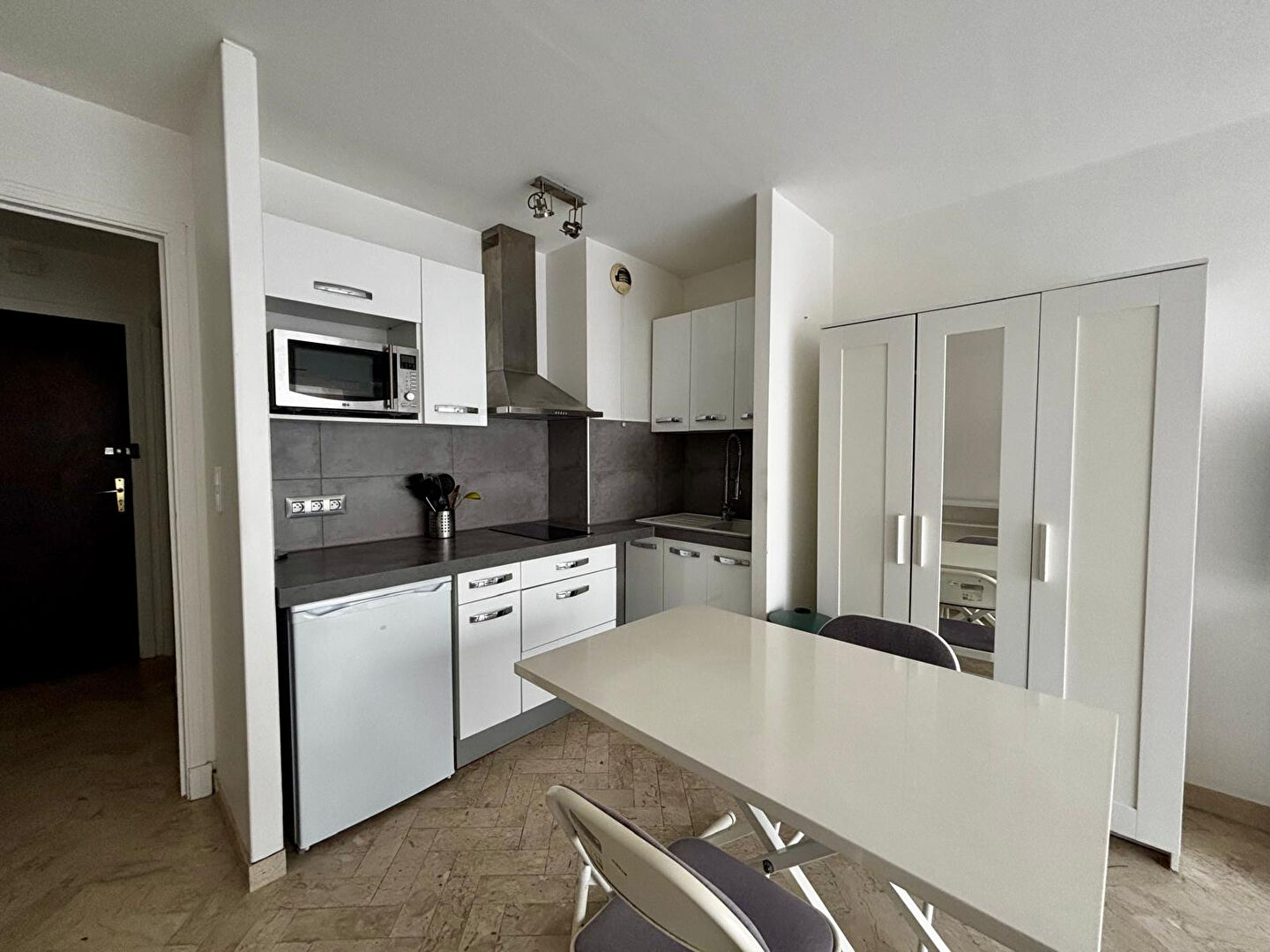 L'appartement se compose d'une pièce de vie lumineuse avec espace nuit et coin repas, d'une cuisine équipée, ainsi que d'une salle de bain avec WC.