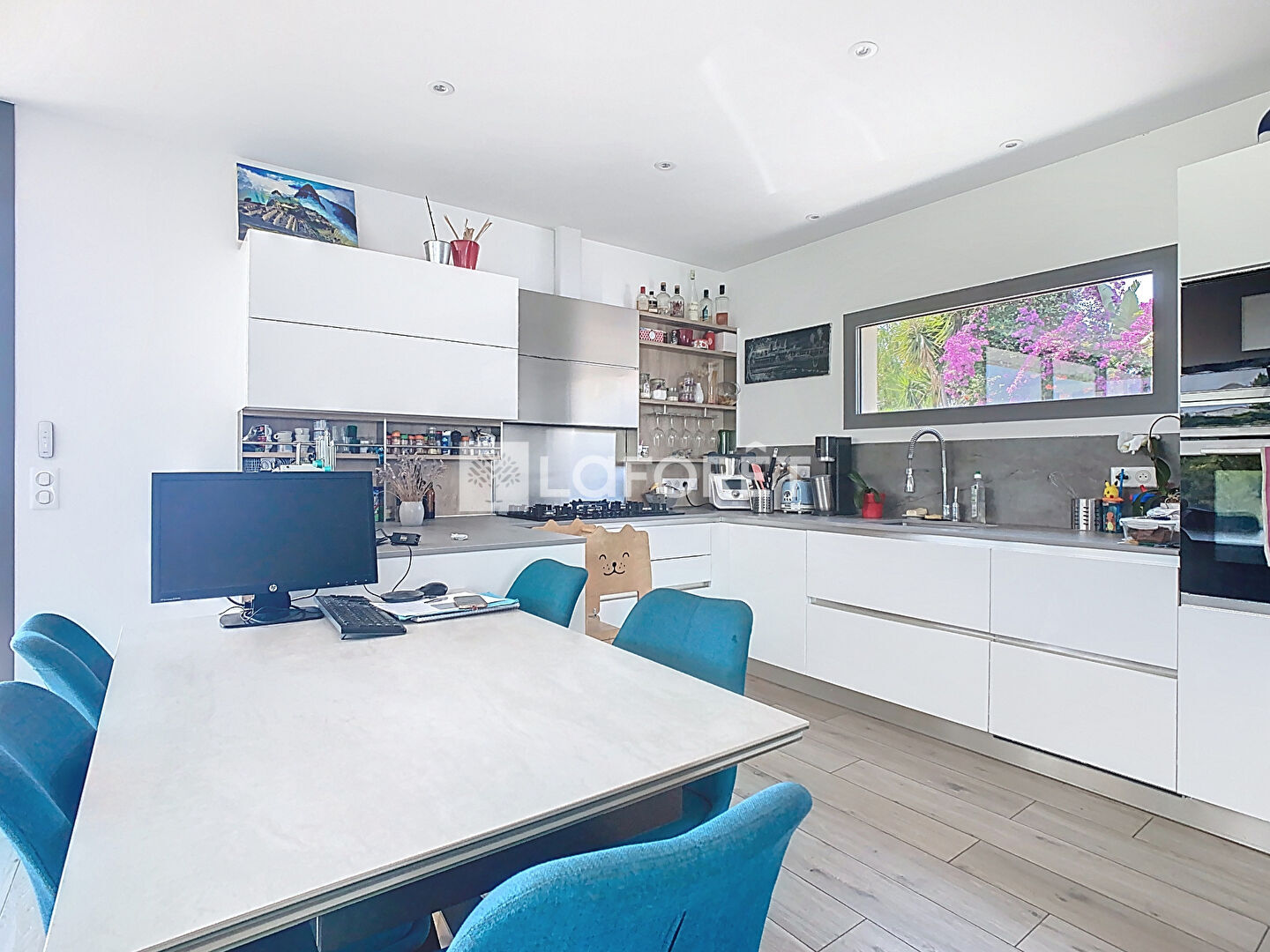 Dès l'entrée, le premier niveau vous séduira par sa cuisine contemporaine ouverte sur un vaste séjour équipé d'un poêle à bois, et baigné de lumière grâce à une grande baie vitrée d'angle donnant sur une terrasse ensoleillée. Ce niveau comprend également des toilettes invités et une buanderie discrète.