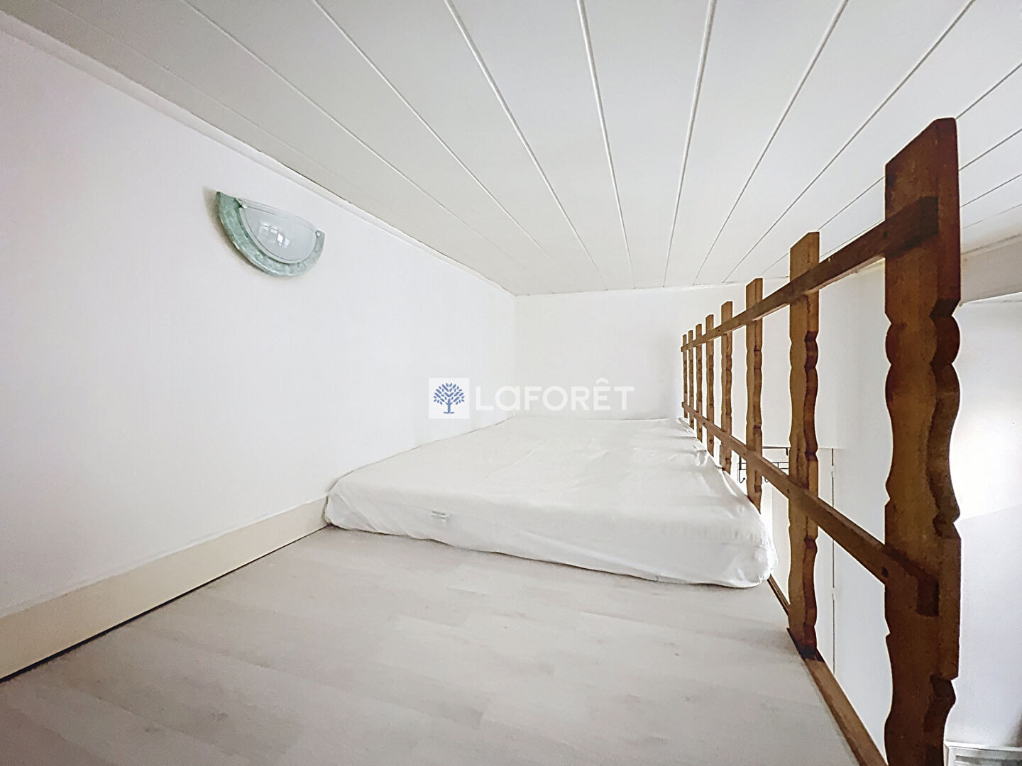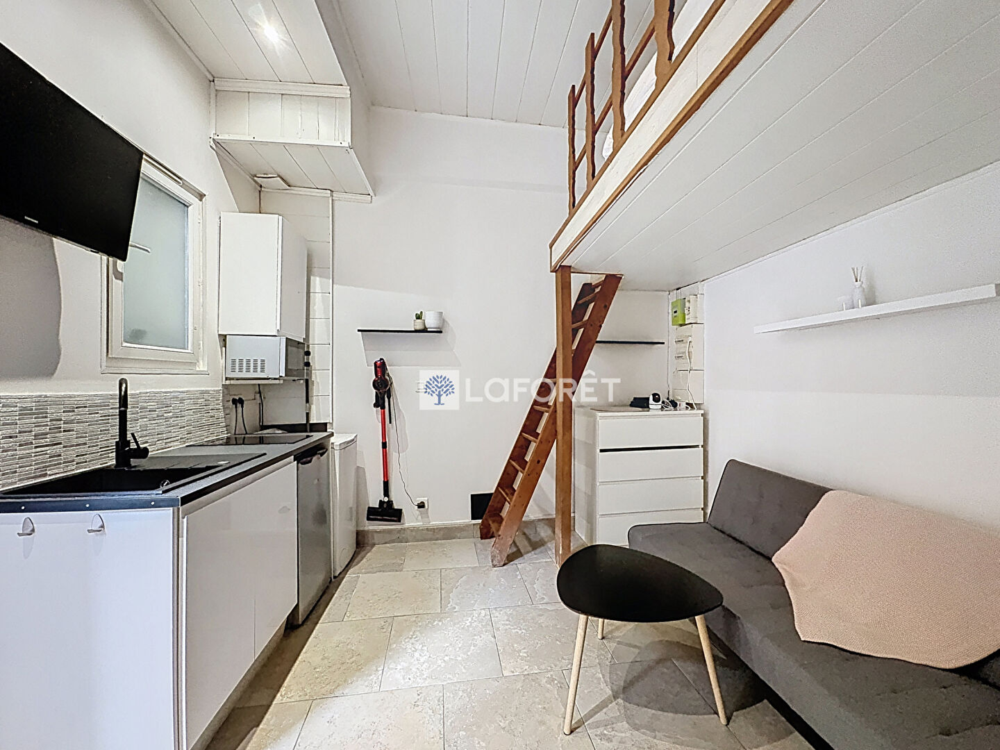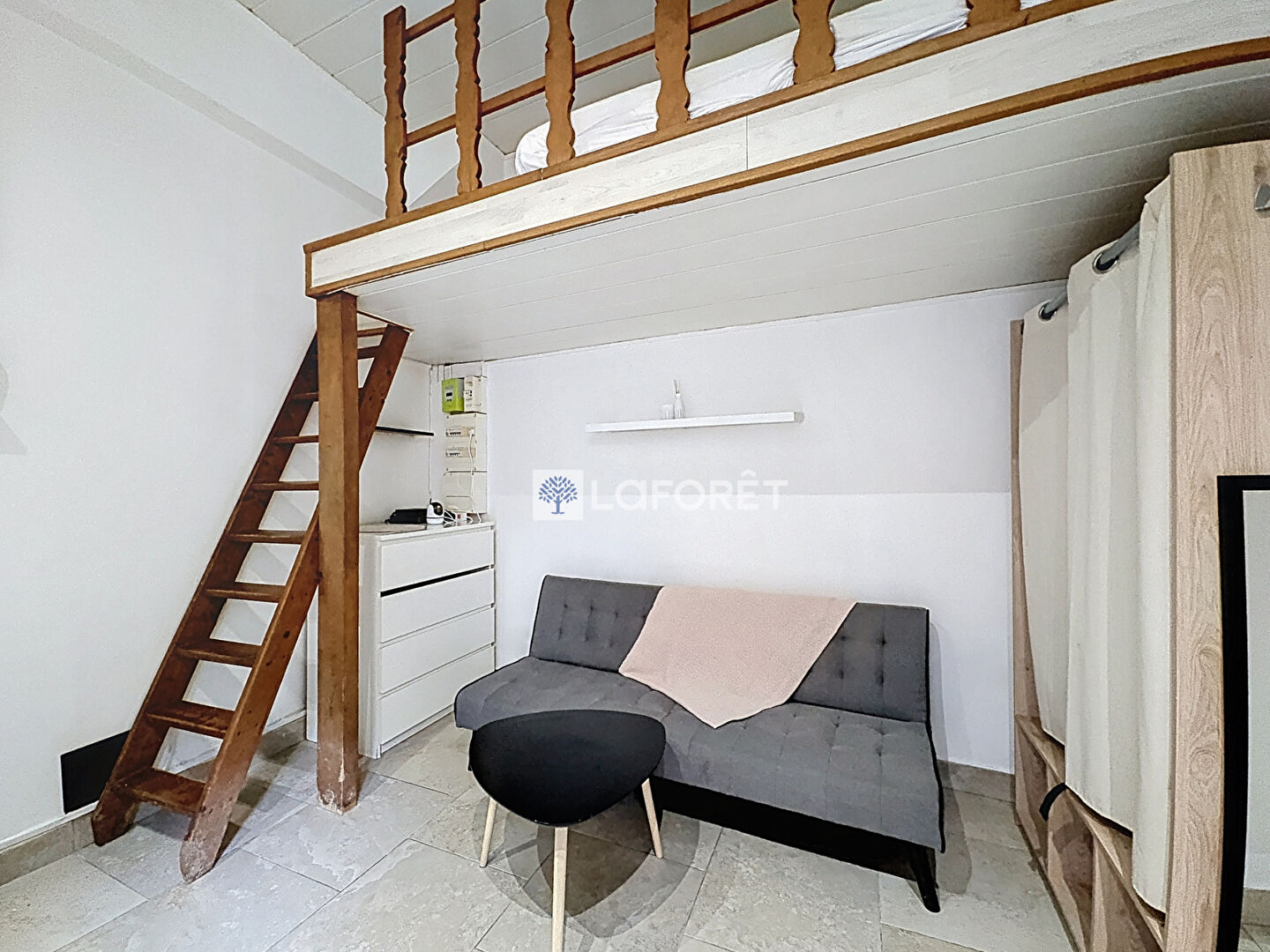 Une mezzanine avec un lit en 120 cm permet d'optimiser l'espace et de dégager la pièce principale.