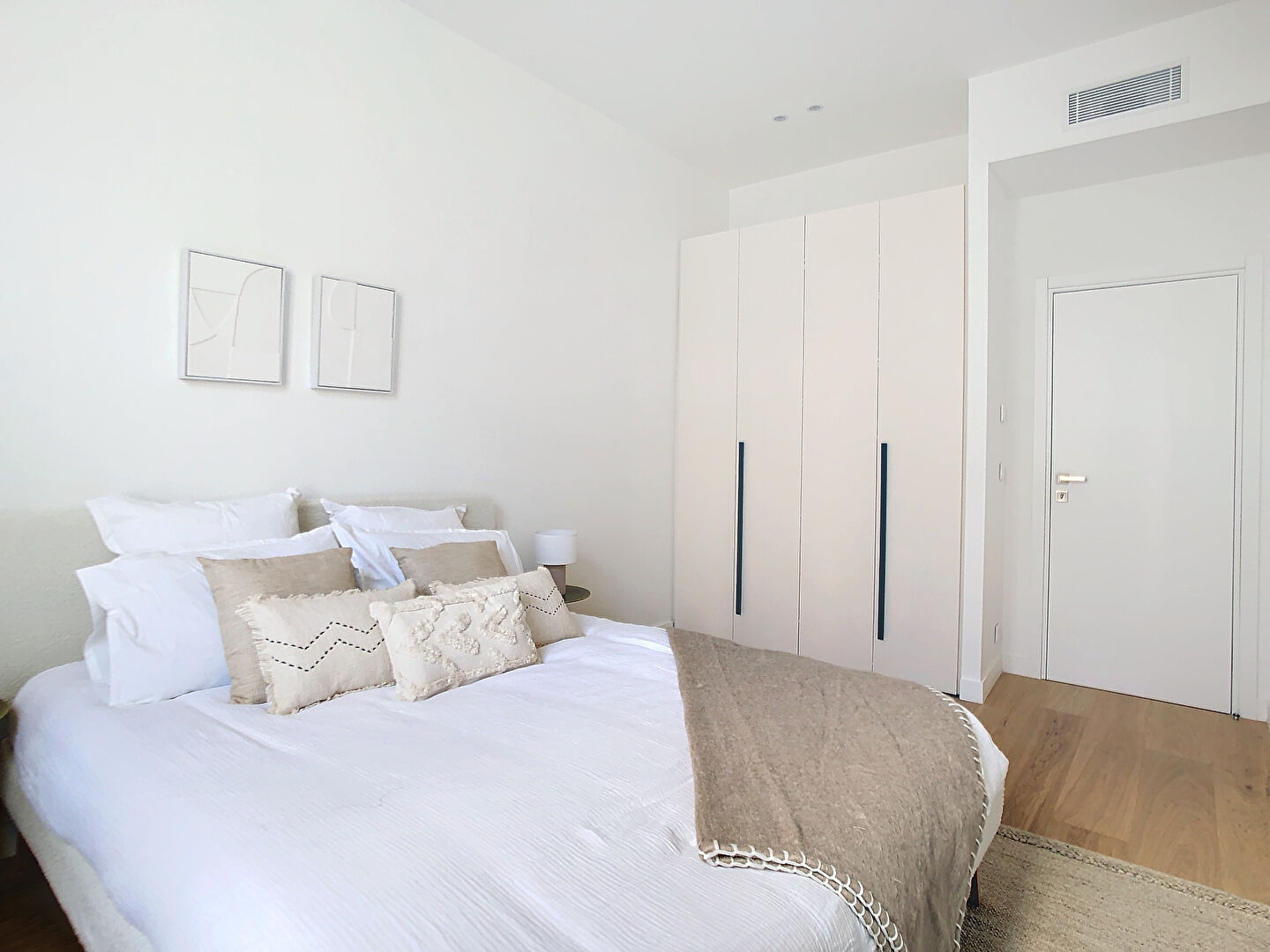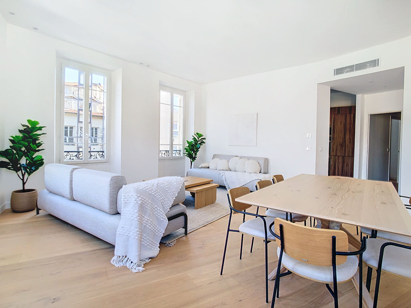 L'entrée dessert harmonieusement l'ensemble des pièces, dont un vaste séjour / salle à manger de 34 m², ouvrant sur la Place du Pin et bénéficiant d'une vue dégagée jusqu'au Mont Boron. La cuisine équipée, attenante, est semi-ouverte sur l'espace de vie.