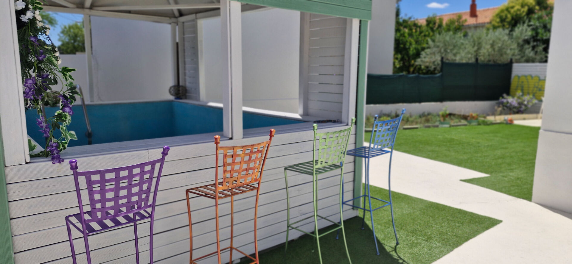 Vous bénéficierez de prestations telles que la climatisation réversible, cuisine équipée, garage, jardin avec petite piscine/bar où vous pourrez savourer de moments paisibles.