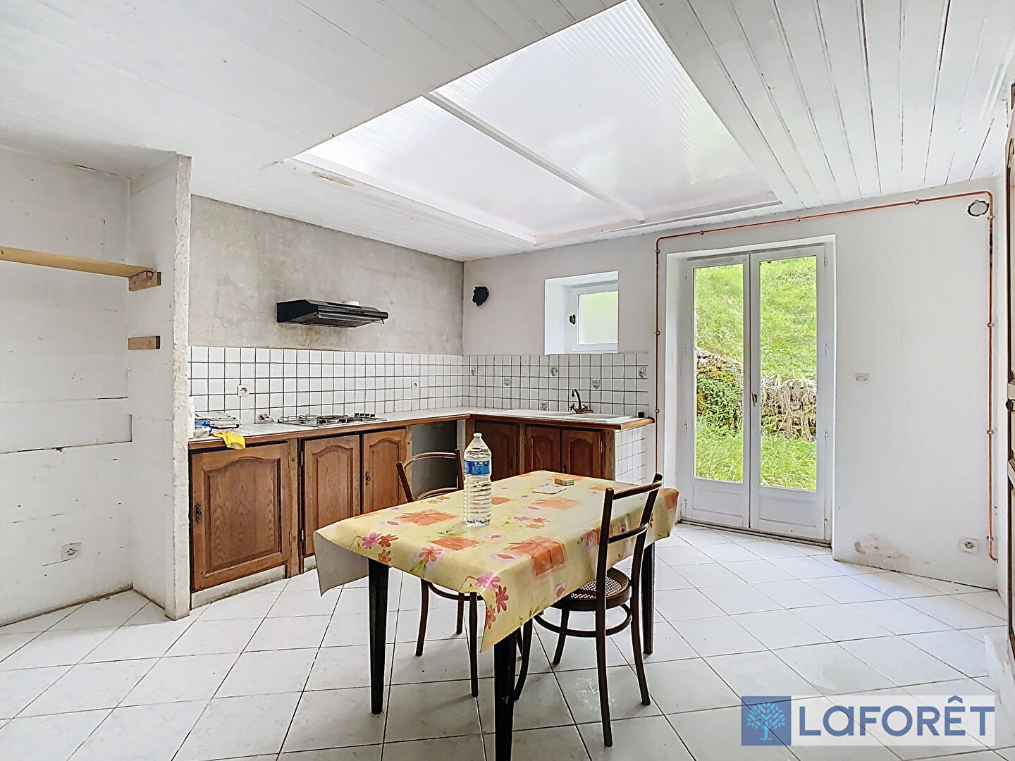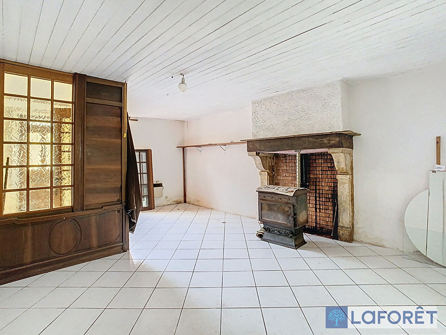 Au rez-de-chaussée elle comprend une entrée, un séjour - salle à manger avec poêle à bois, une grande cuisine avec accès terrain, une salle de bains et un WC séparé.