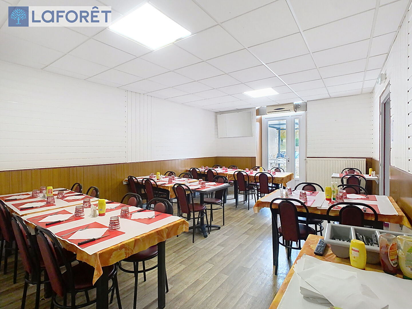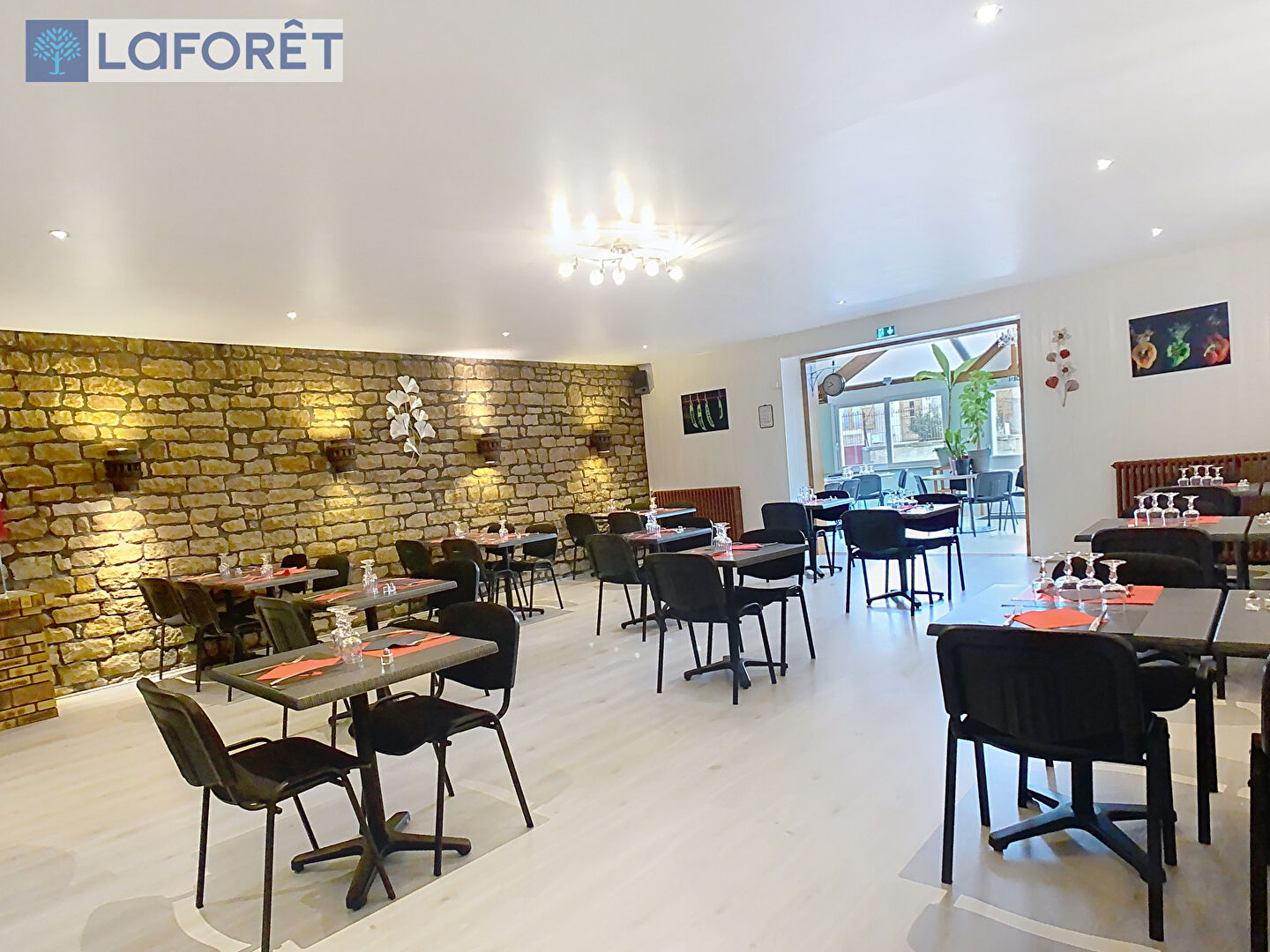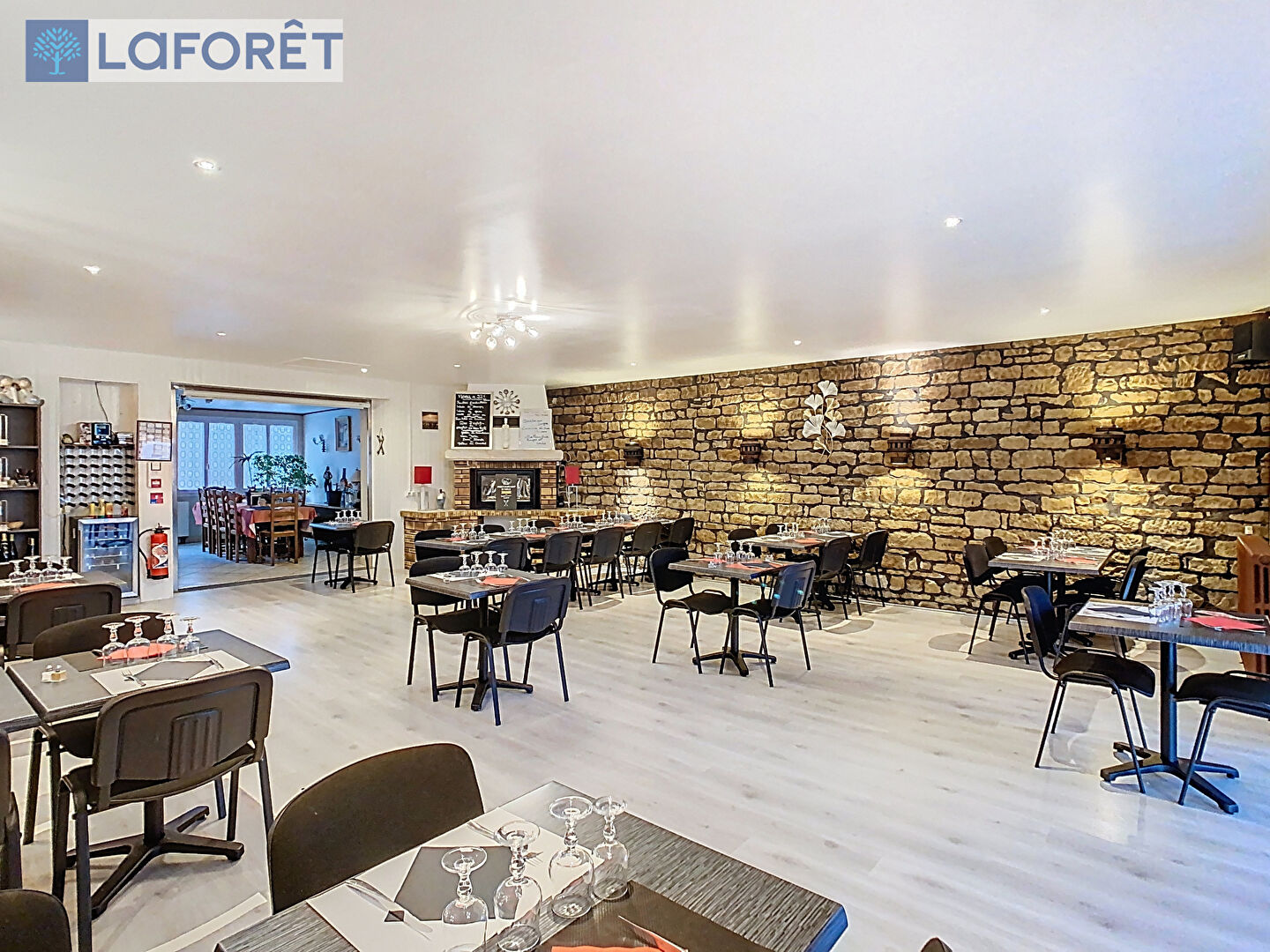 La partie restaurant se compose d'une large entrée, d'un vaste espace de réception clients de plus de 150m² réparti sur quatre salles climatisées (dont une prenant place dans une belle véranda lumineuse), d'un espace sanitaires, d'une salle de bar, d'une cuisine professionnelle de 70m² et d'un espace pouvant accueillir de la clientèle en nuitées composé de trois chambres et d'une salle d'eau.