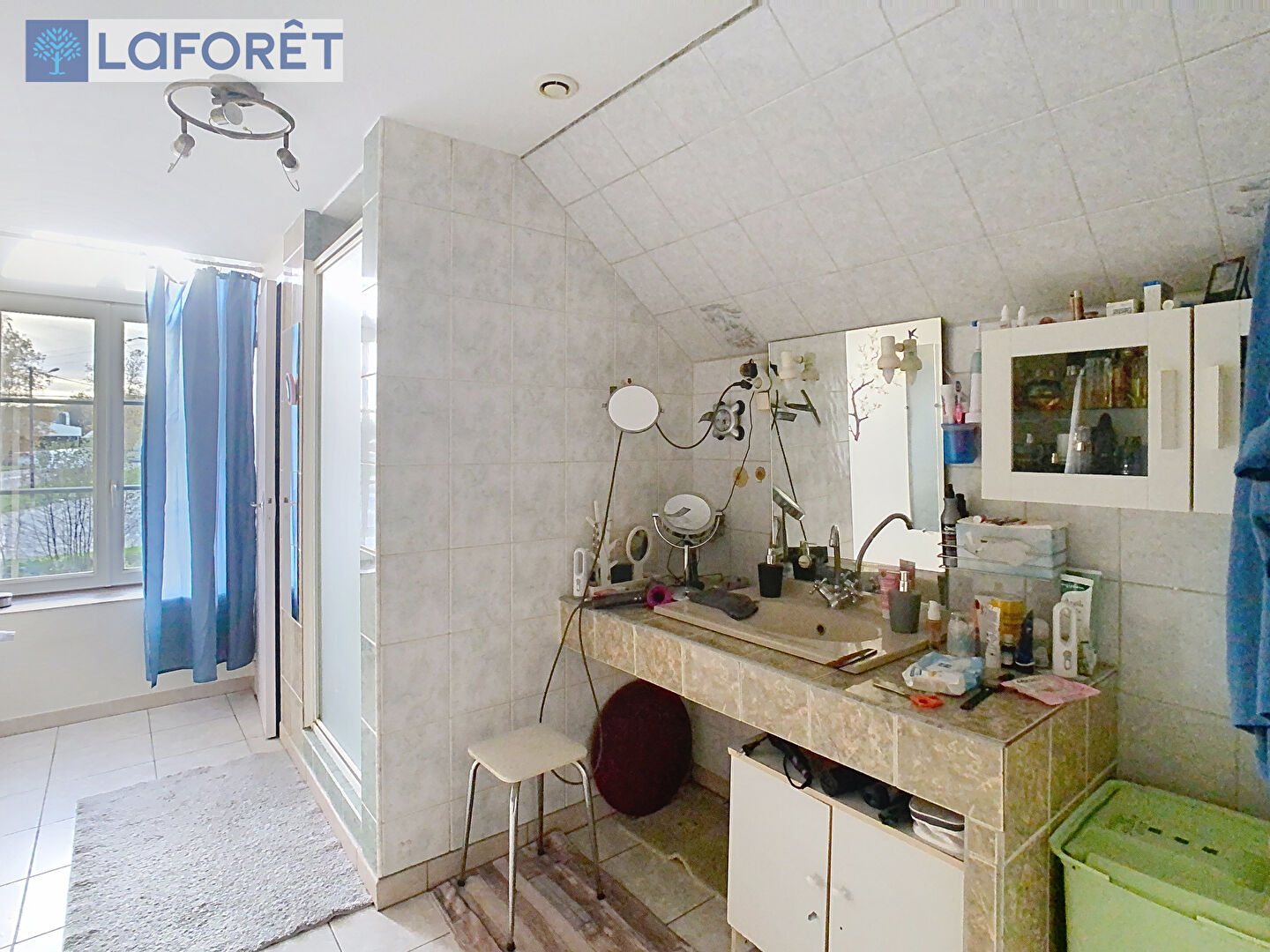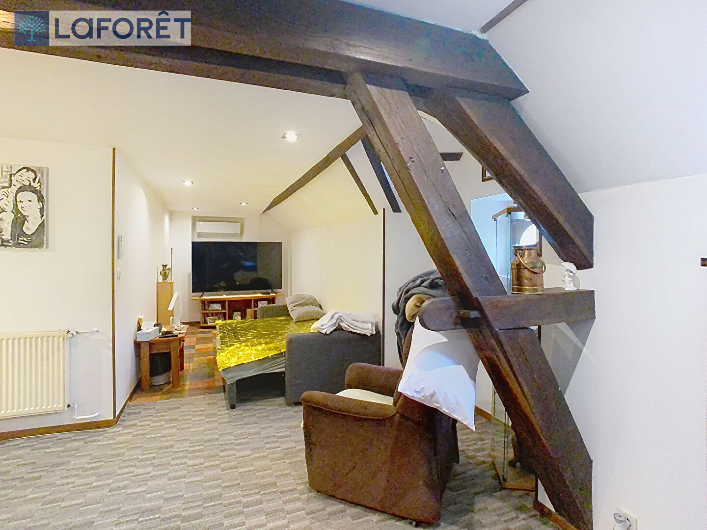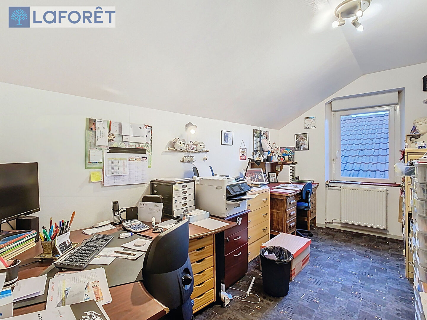 L'étage comporte un grand logement aménagé avec une pièce de vie, six chambres, un bureau, deux salles d'eau, un WC et un grenier de 80m² au palier supérieur.