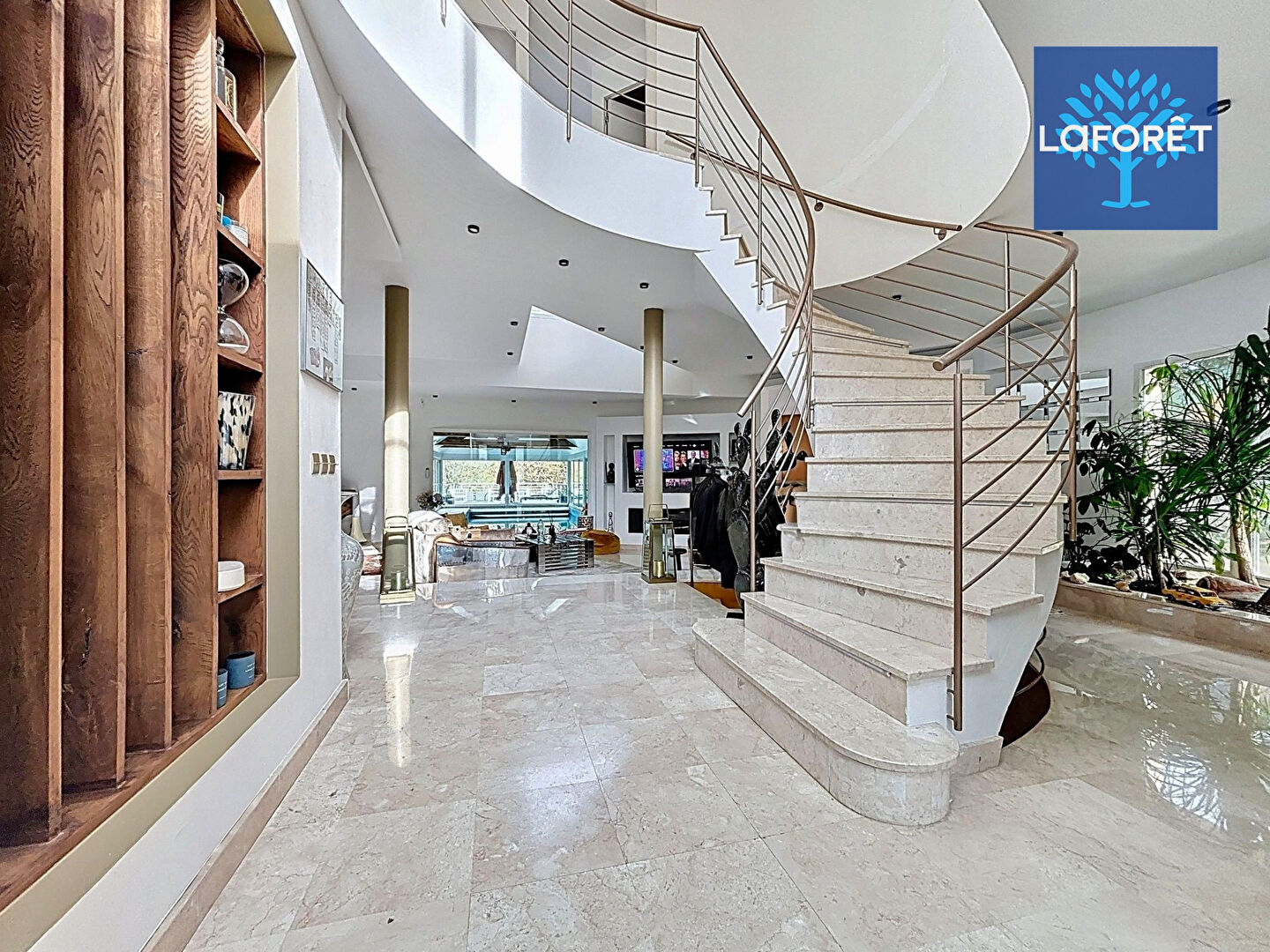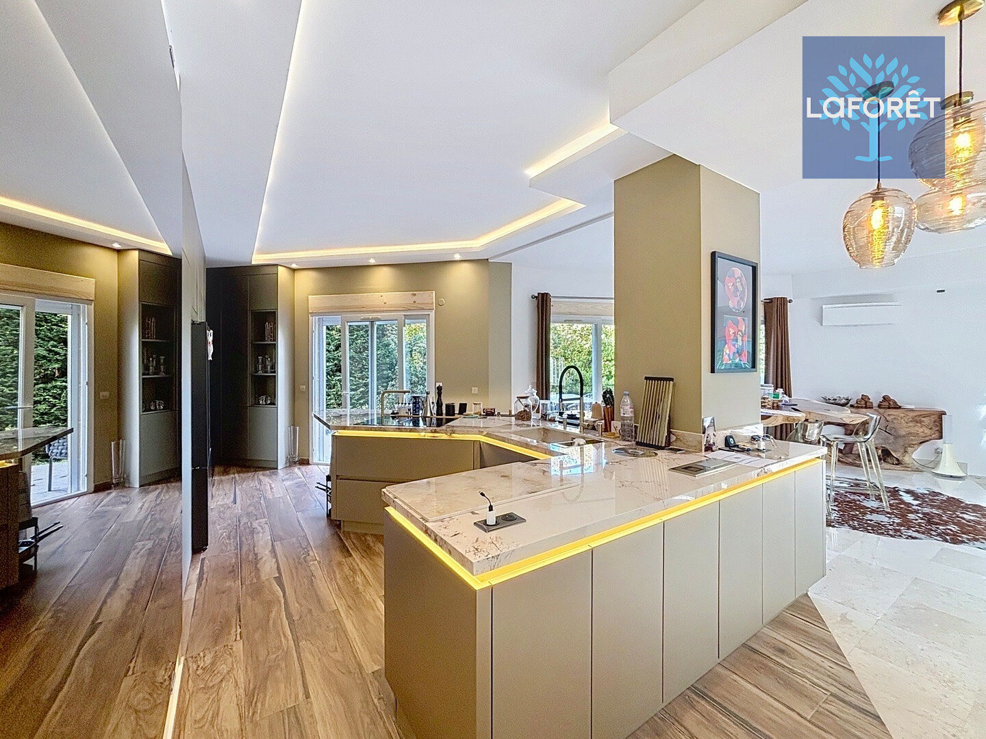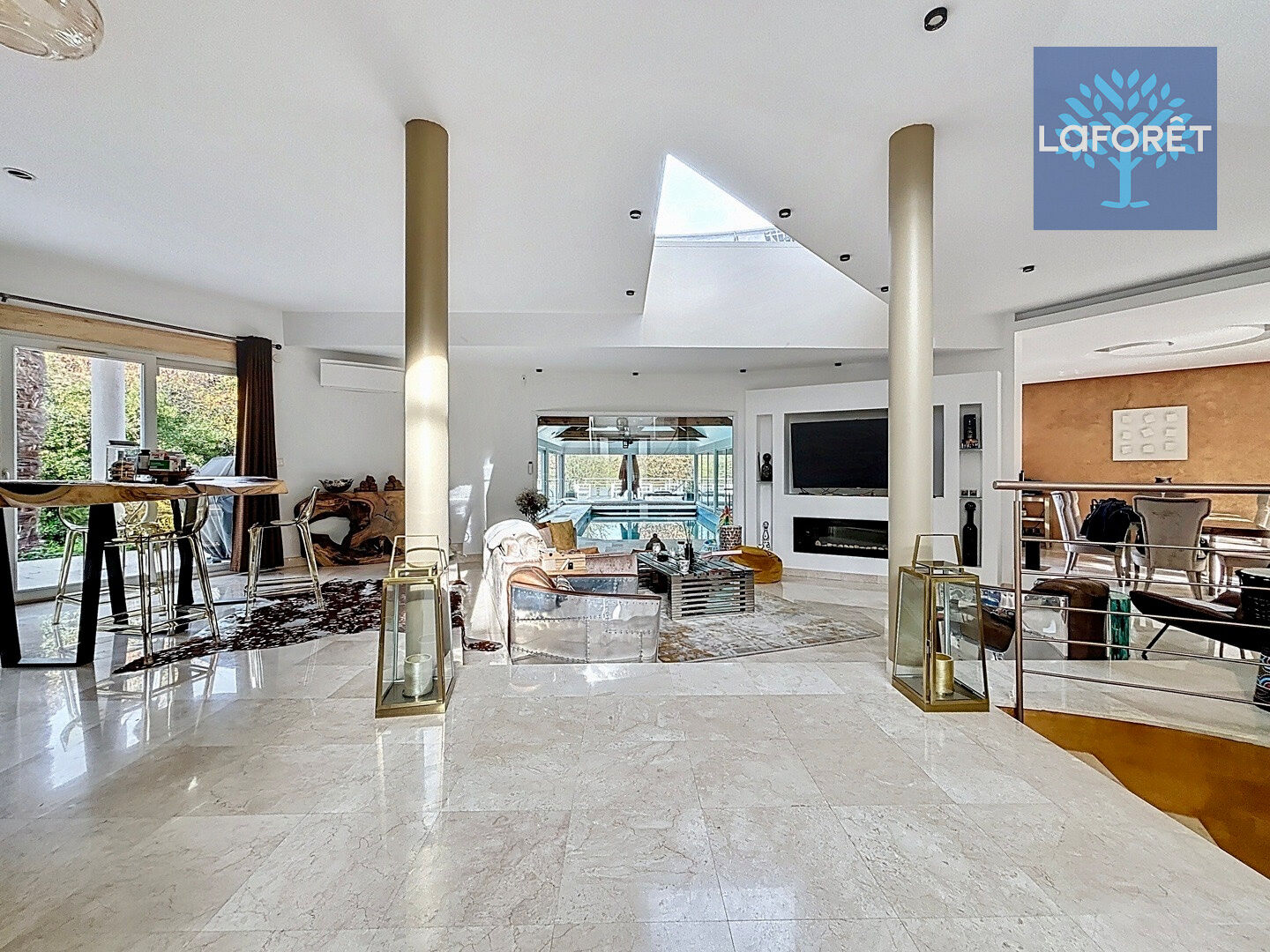 Édifiée sur un terrain arboré de plus de 2 300 m², elle offre 350 m² habitables baignés de lumière et un séjour aux volumes spectaculaires, conçu pour sublimer l'espace et la convivialité.