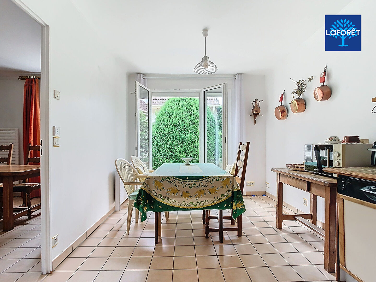un séjour de plus de 38 m² lumineux qui donne sur un jardin, une salle à manger 18m2 indépendante et une cuisine séparée qui donne aussi sur le jardin, une buanderie, un garage qui communique avec la maison et des w-c séparés.