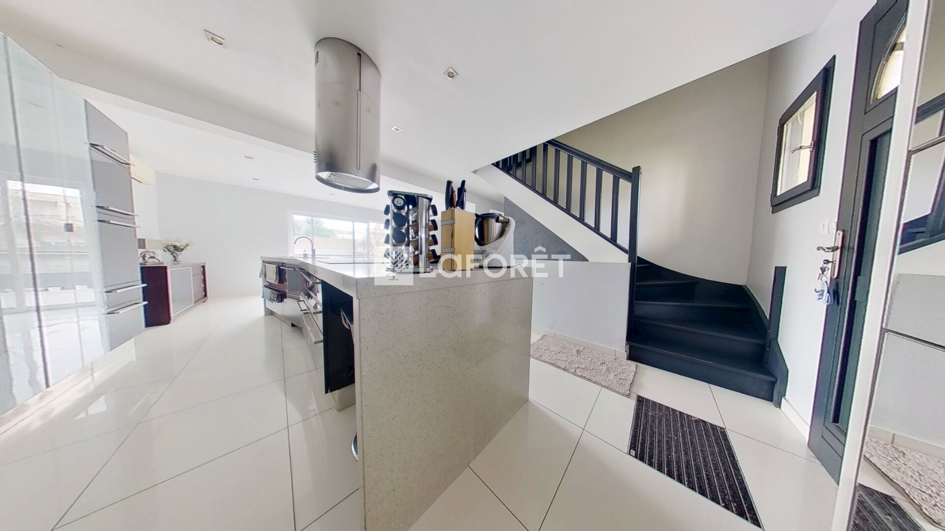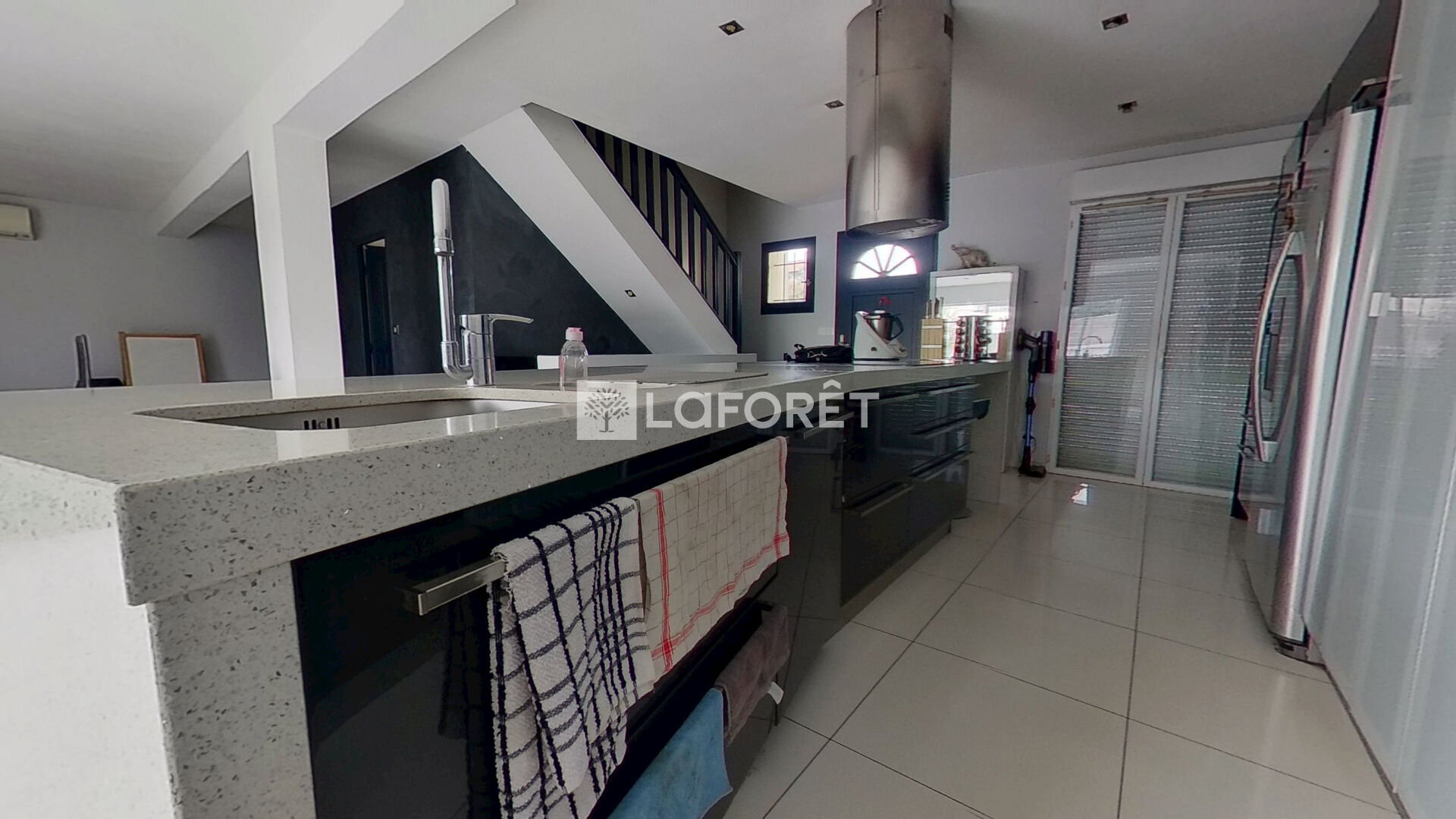Elle se compose au rez-de-chaussée d'un bel espace de vie lumineux avec une cuisine ouverte moderne, ainsi qu'une salle d'eau avec WC.