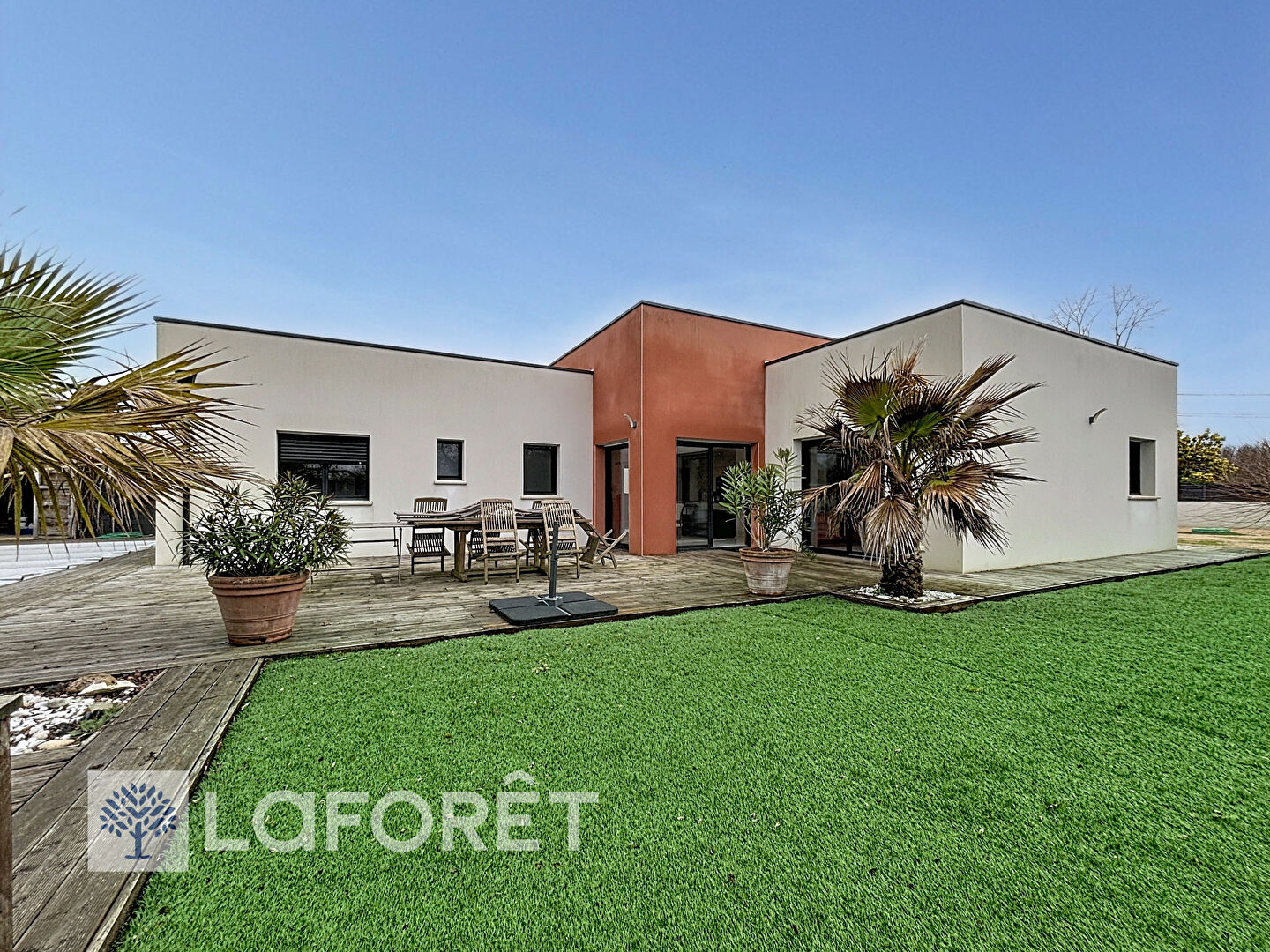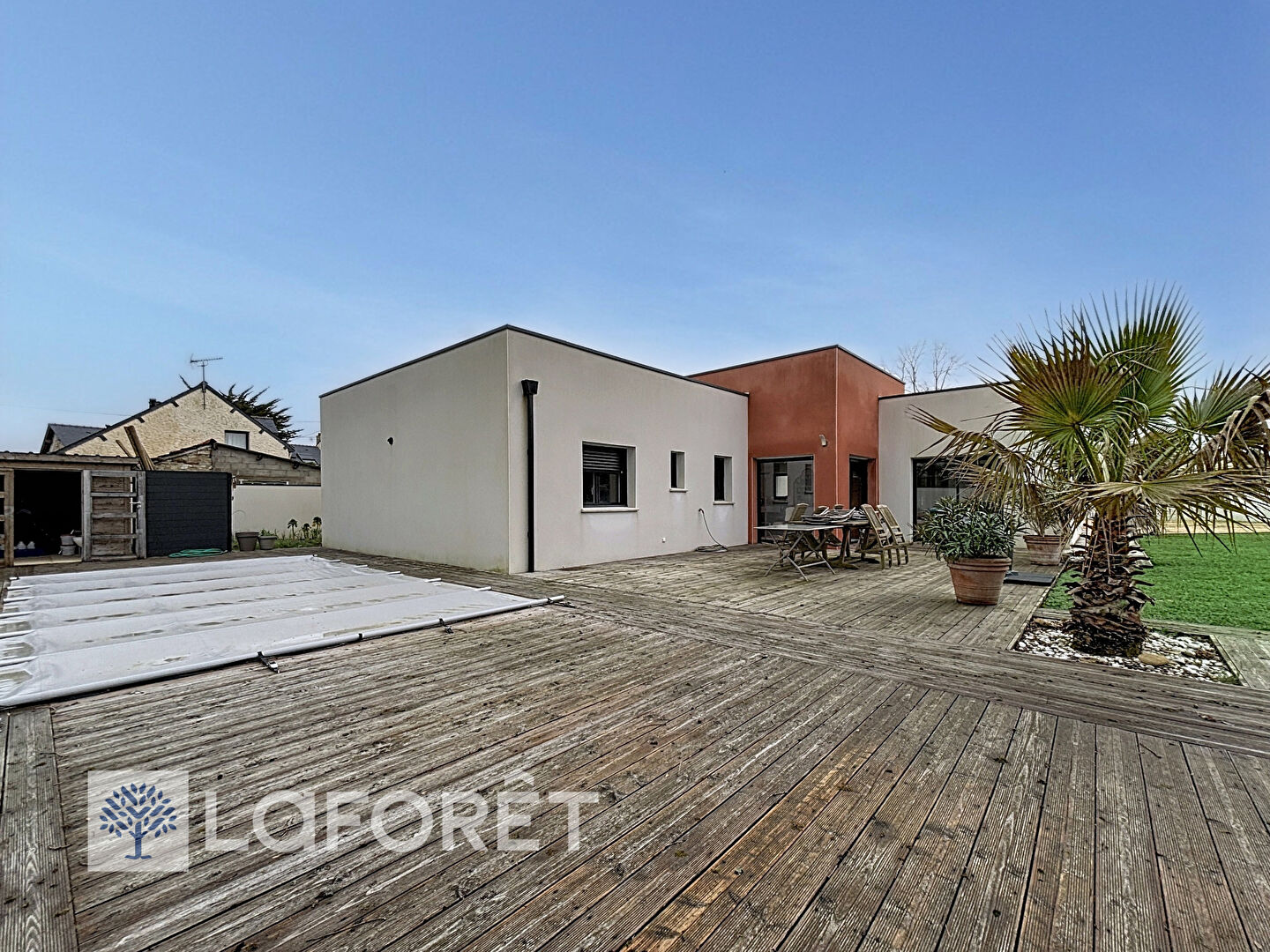 Terrain clos et sécurisé sans vis à vis de plus de 1000 m² avec terrasses SUD et OUEST et piscine chauffée par pompe à chaleur.