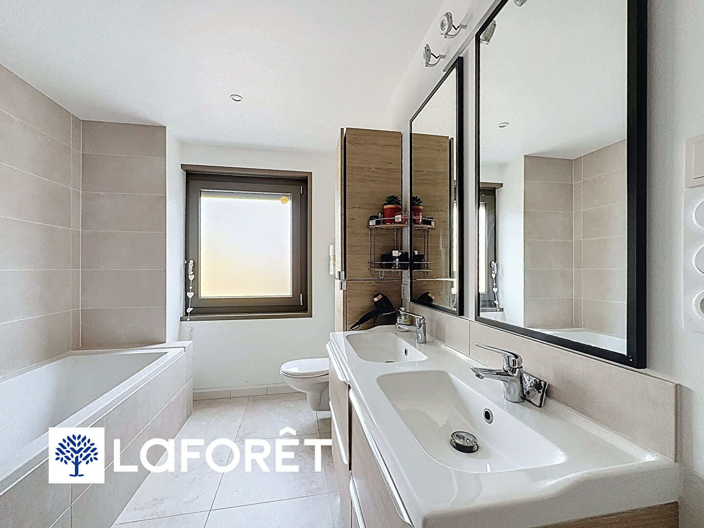 S'ajoutent une buanderie, une grande salle de bain, ainsi qu'un double garage neuf en cours de finition, parfait pour le rangement ou le stationnement.