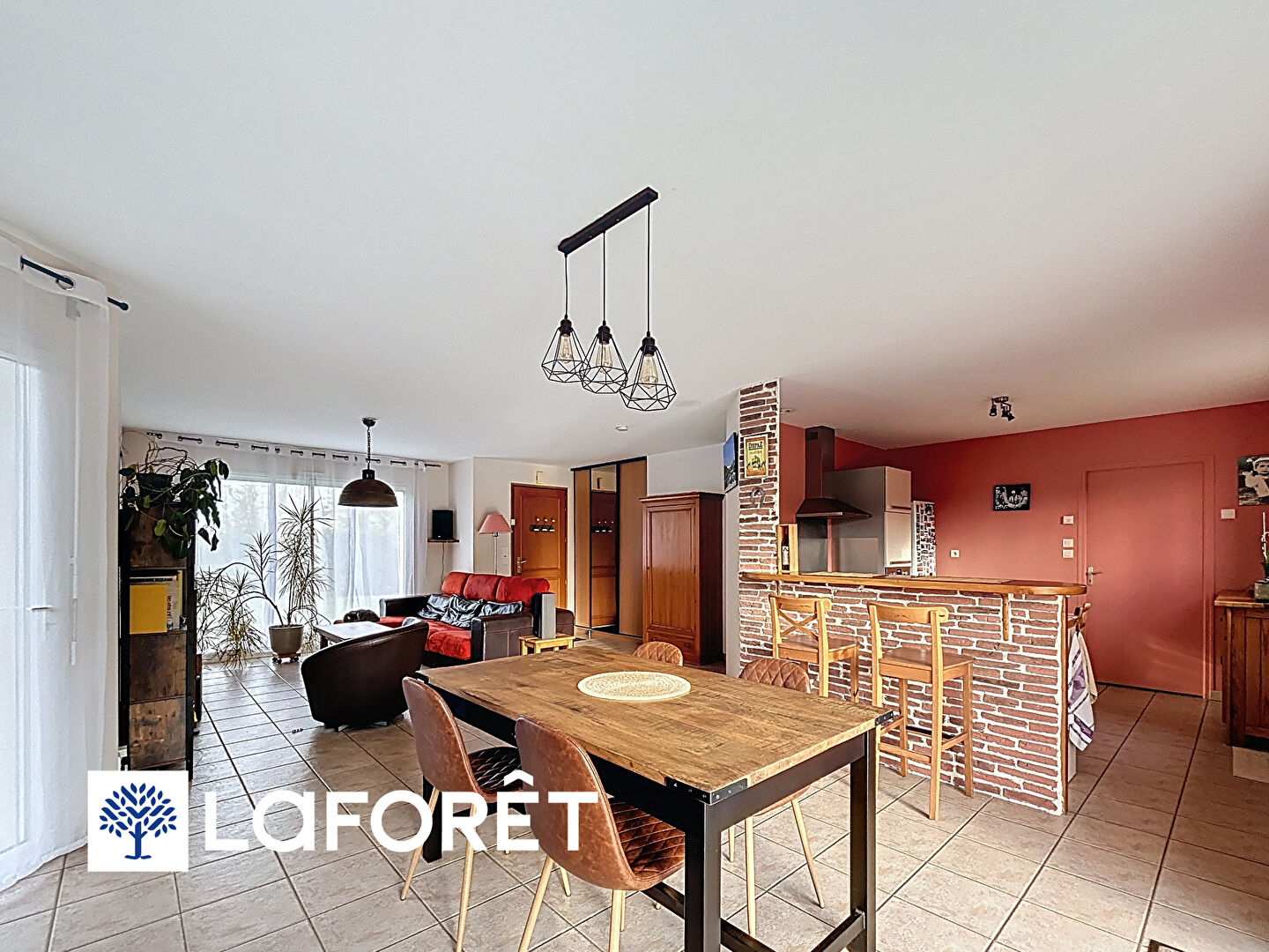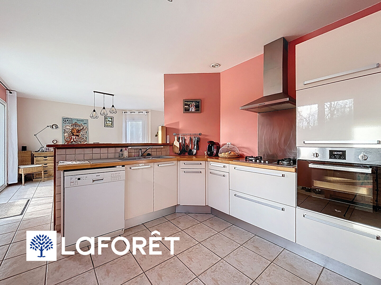La maison propose une entrée avec placards, une belle pièce de vie lumineuse, bénéficiant d'une triple exposition, avec une cuisine ouverte aménagée et équipée, conviviale et fonctionnelle.