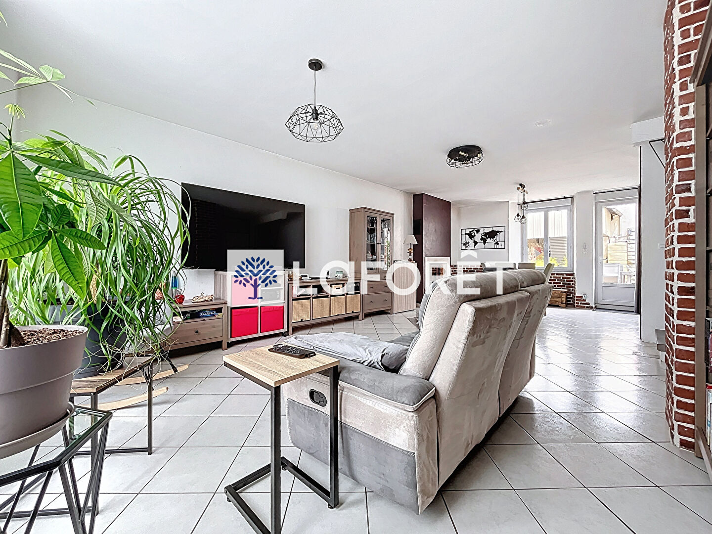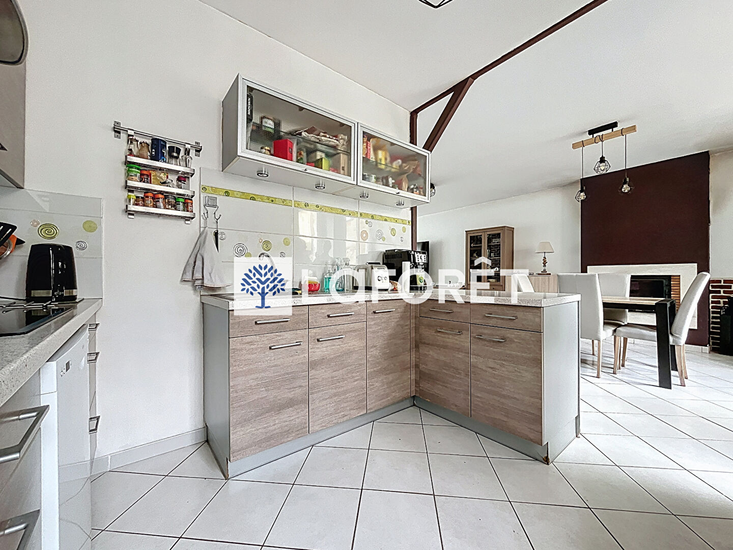 La maison se compose au rez-de-chaussée, d'un salon/séjour lumineux de 53 m2 ouvert sur un coin cuisine aménagée et équipée (plaque de cuisson, une hotte, un four), une buanderie, un WC séparé.
