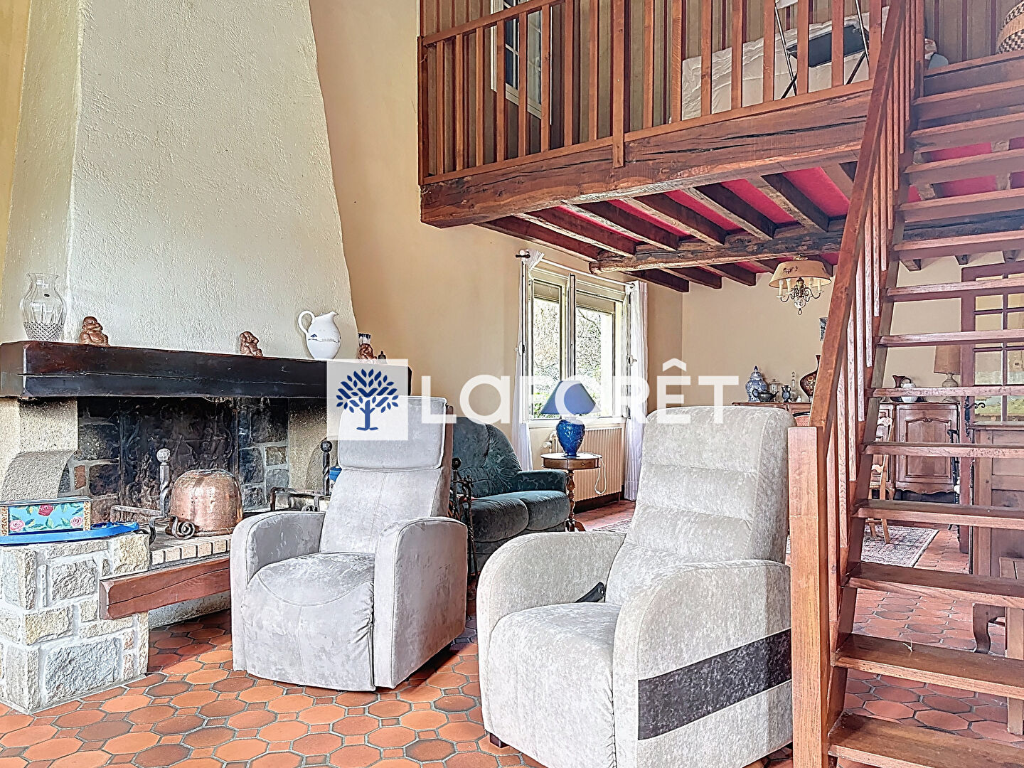 À l'étage: une chambre, un bureau un WC et un accès à la mezzanine surplombant le salon, idéale pour un espace détente ou lecture.