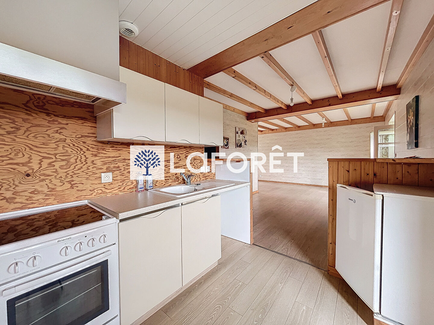 Une pièce de vie ouverte sur une cuisine aménagée, une chambre séparée avec placards intégrés, une salle d'eau avec douche à l'italienne, toilette et un coin buanderie.