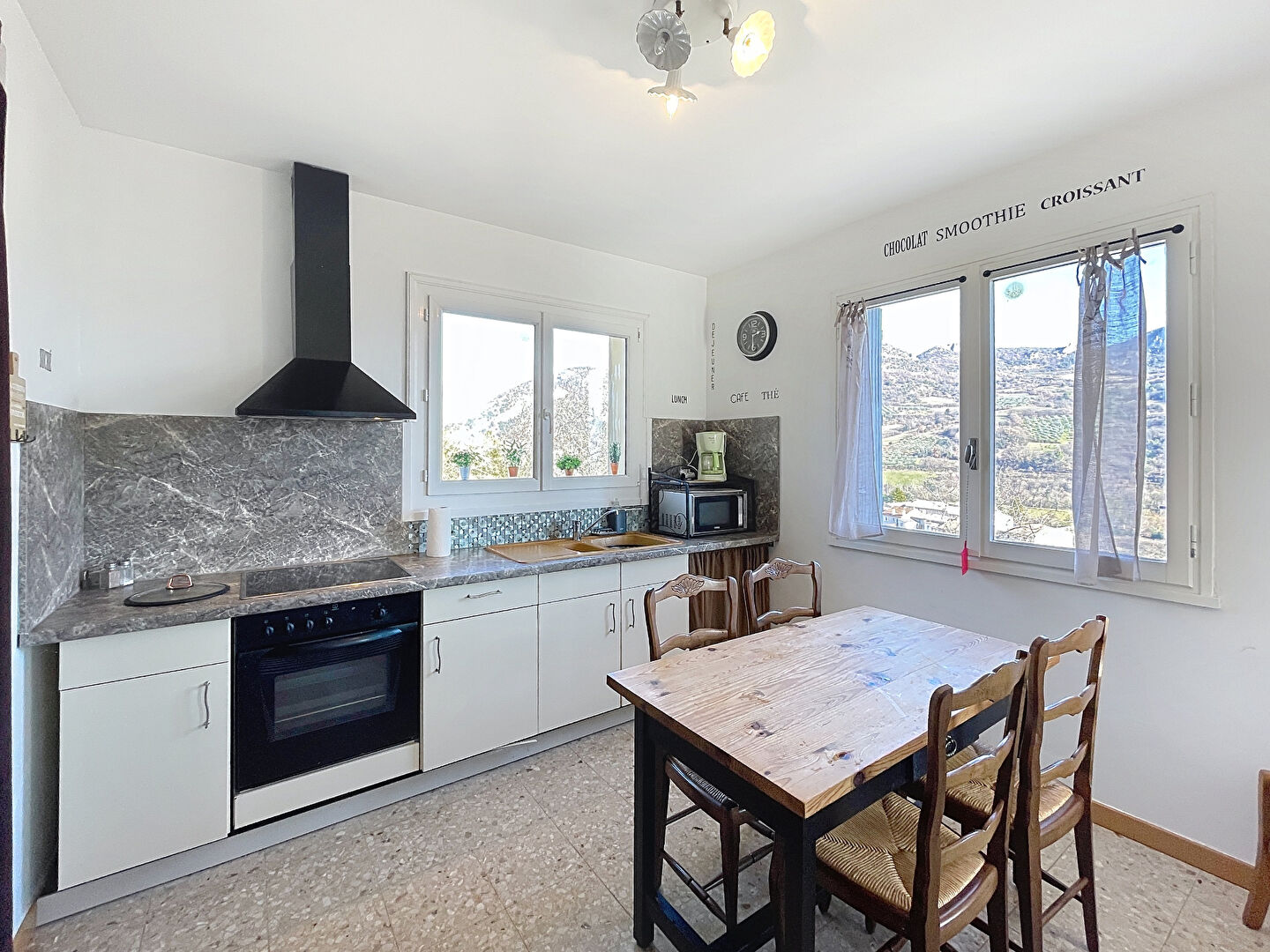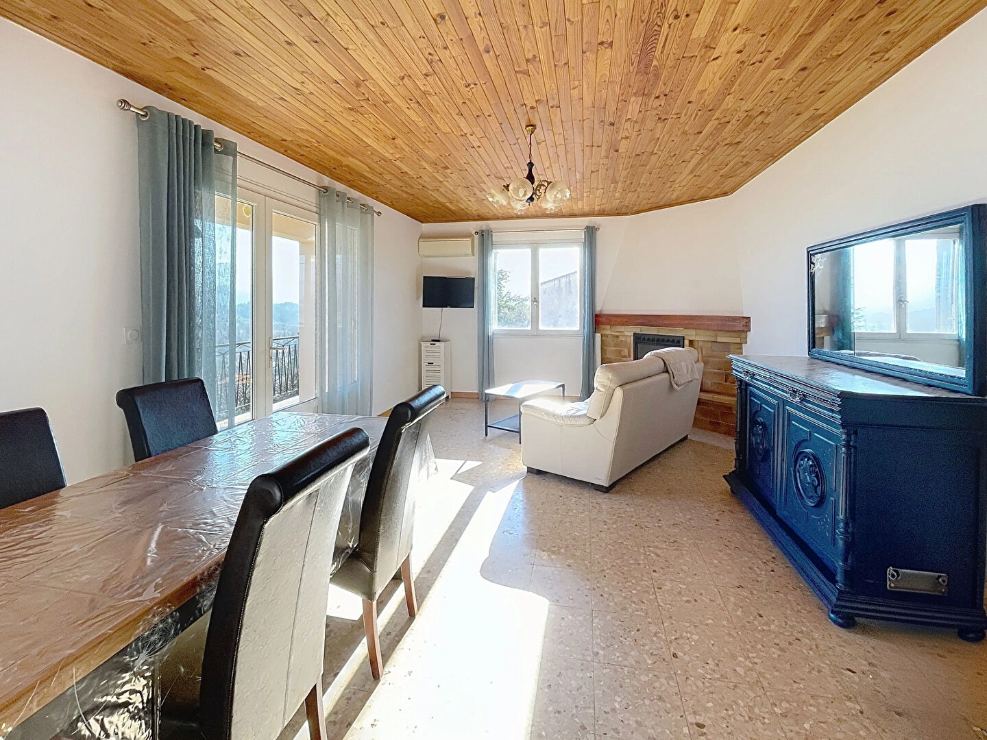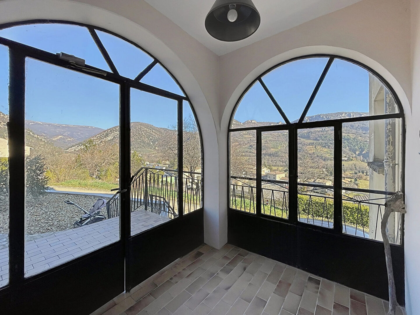 Une charmante véranda vous accueille sur le seuil du niveau supérieur et une terrasse accessible depuis le séjour vous offre un espace convivial pour profiter d'une superbe vue dégagée sur les montagnes environnantes.
