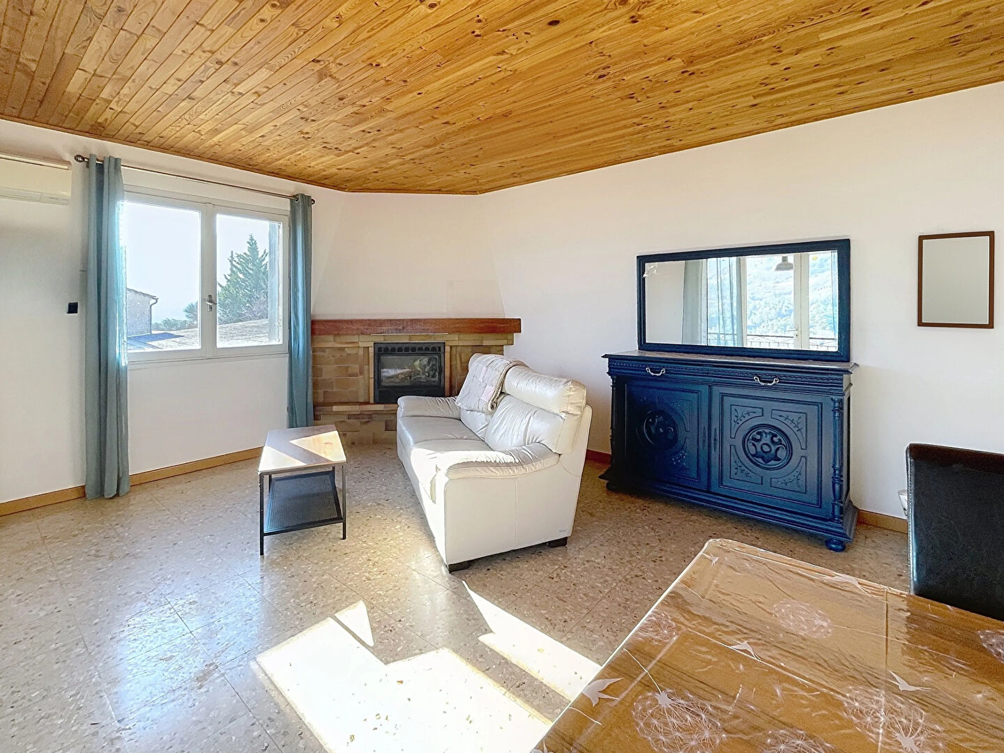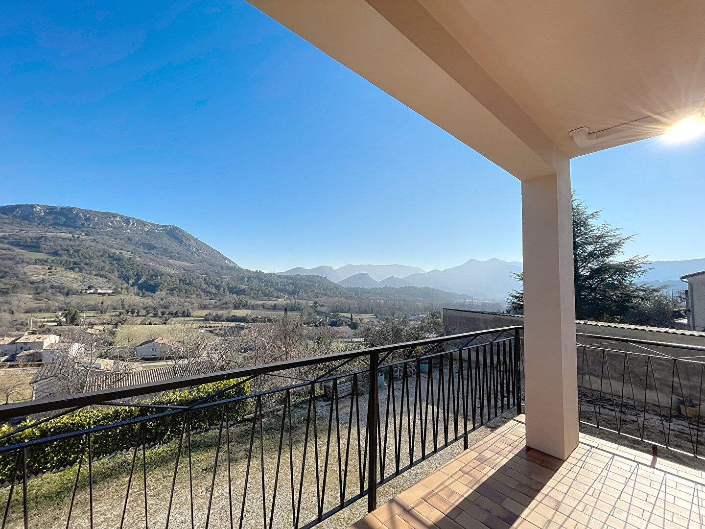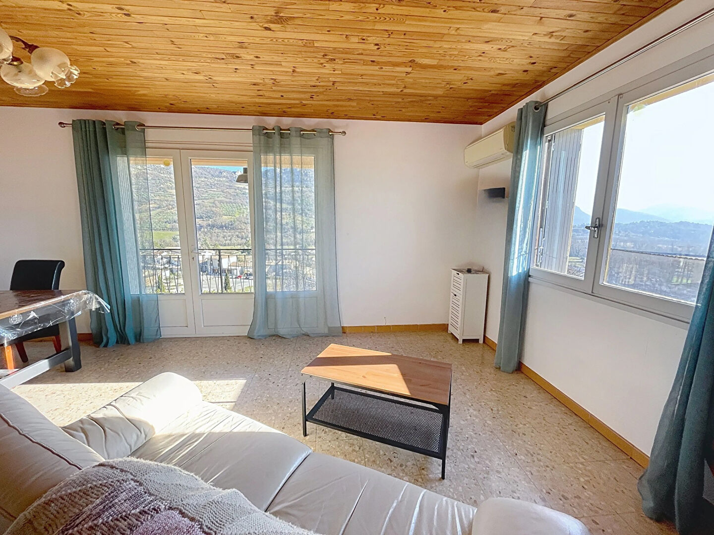Une charmante véranda vous accueille sur le seuil du niveau supérieur et une terrasse accessible depuis le séjour vous offre un espace convivial pour profiter d'une superbe vue dégagée sur les montagnes environnantes.